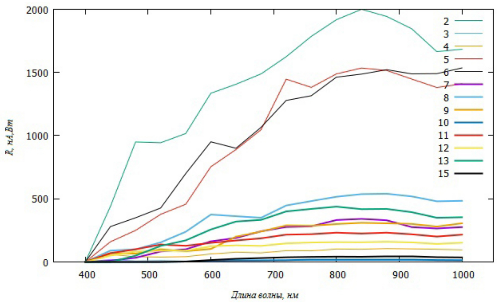 Рис. 4. Спектры фоточувствительности образцов 2–15