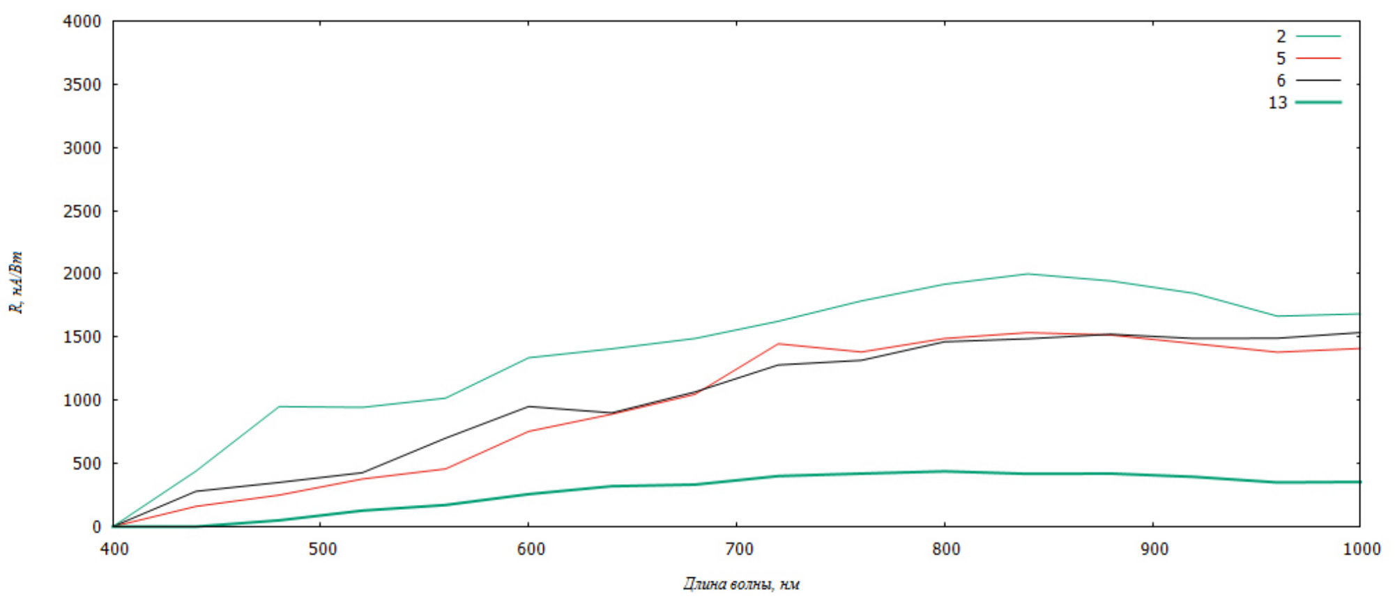 Рис. 5. Спектры фоточувствительности образцов 2, 5, 6 и 13