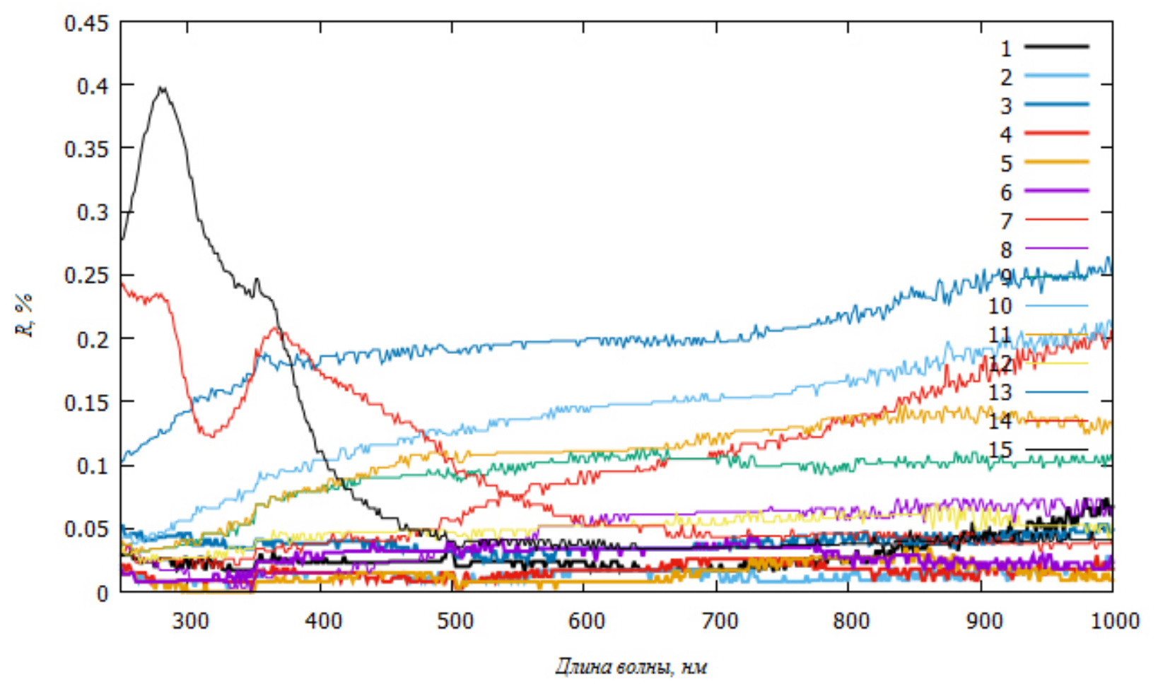 На рис. 7 показаны спектры коэффициента отражения образцов 1–15 в диапазоне длин волн 250–1000 нм.