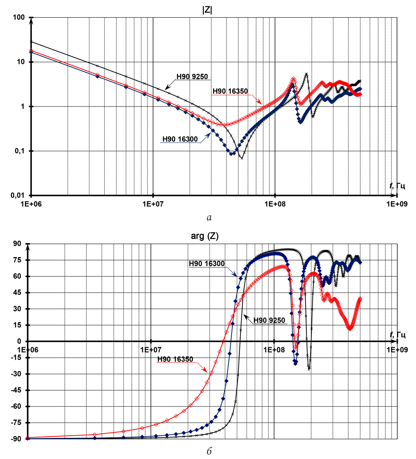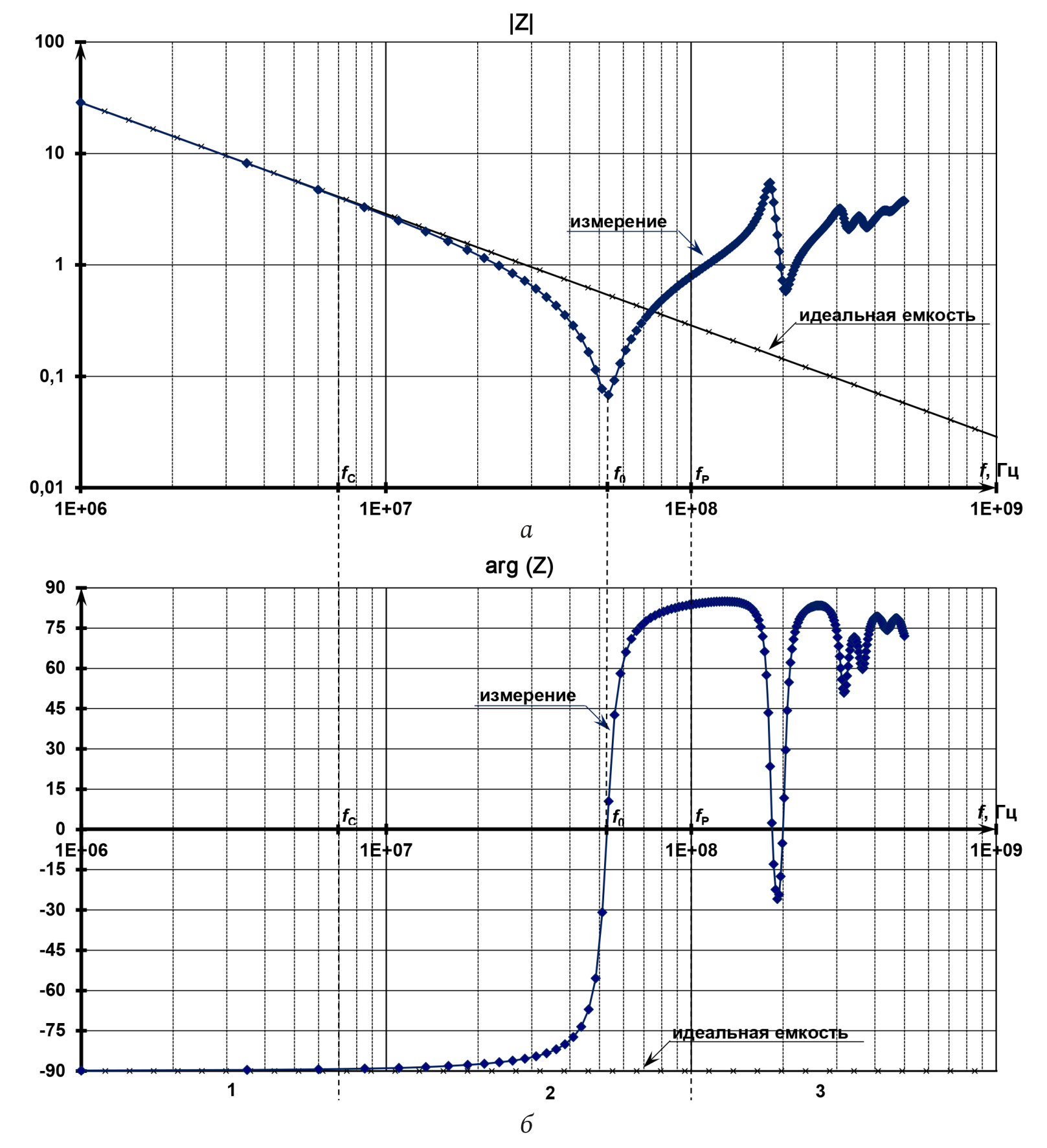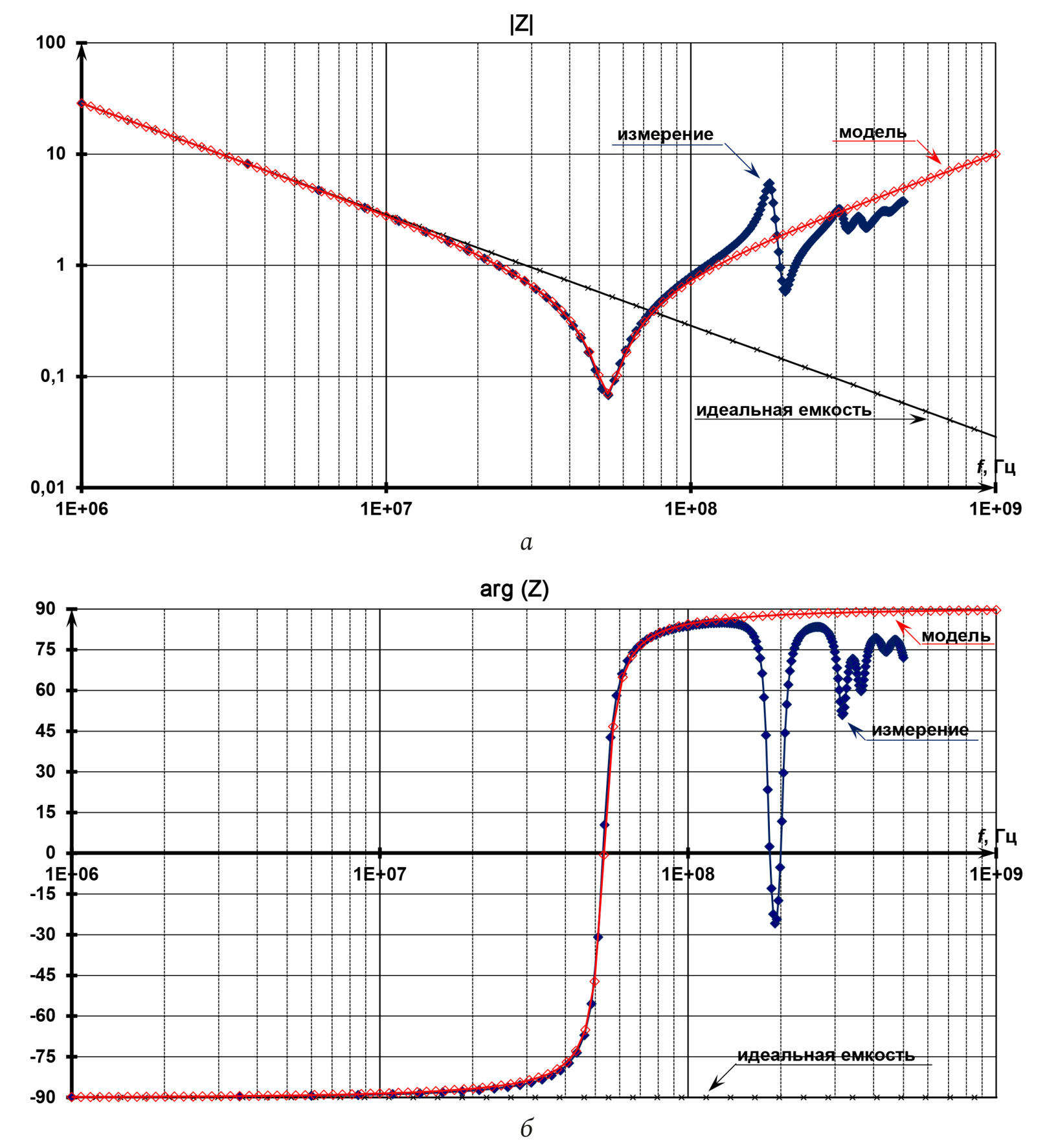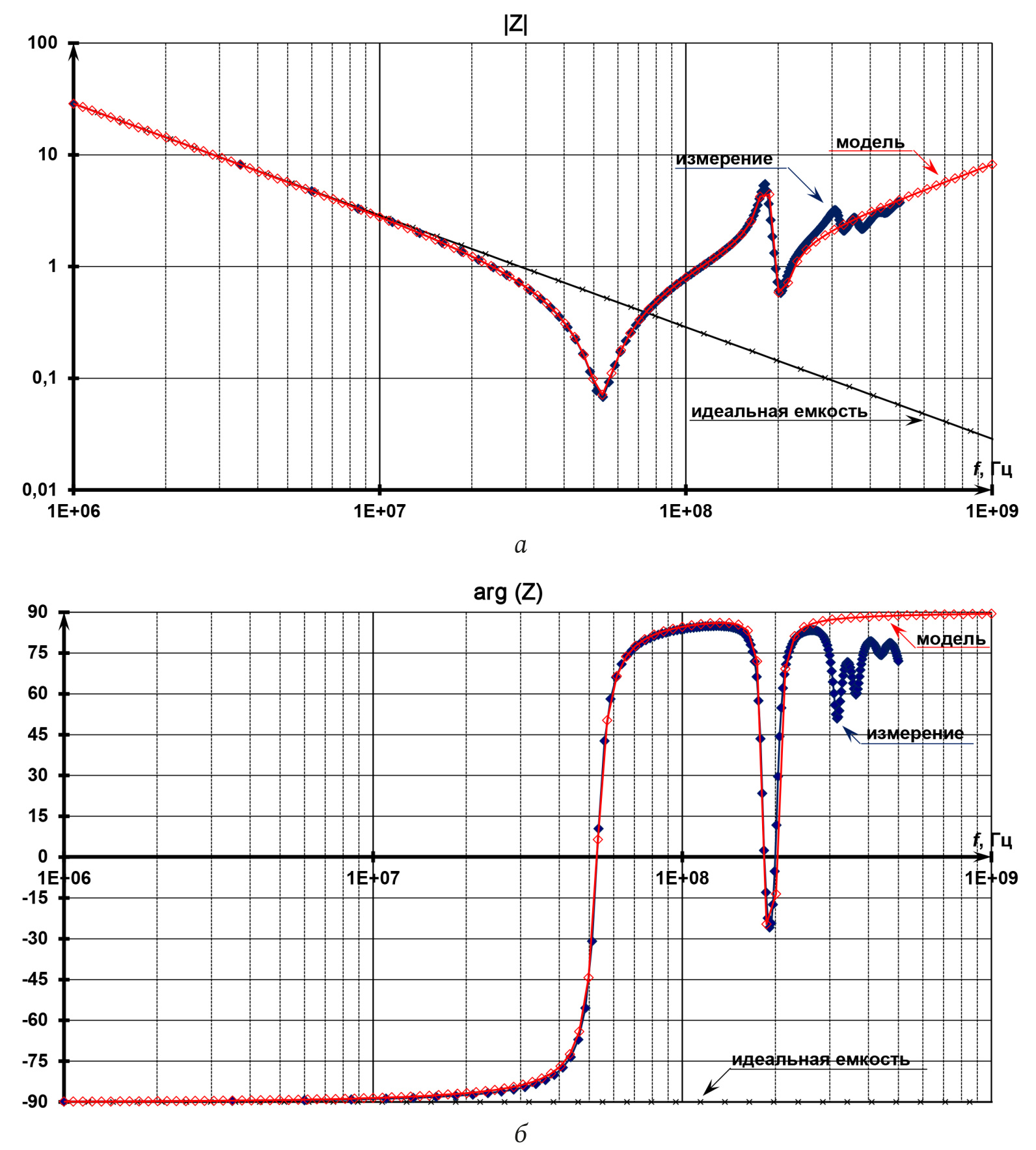 На рис. 7 приведены модуль и фаза измеренного сопротивления диэлектрика, а также модуль и фаза предложенной схемы замещения (рис. 6), которые показывают хорошее совпадение для участков 1 и 2 (рис. 5). Получившиеся параметры схемы замещения (рис. 6) для рассматриваемого диэлектрика (Н90 9250): C = 5,55 нФ, LC = 1,6 нГн, RC = 70 мОм.