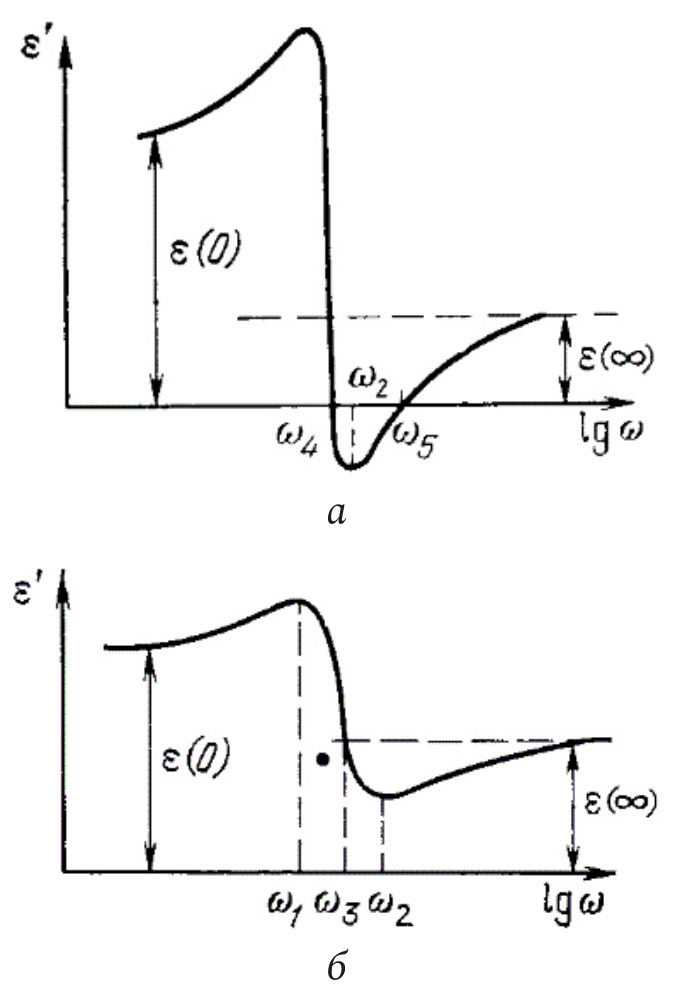 Рис. 10. Частотные зависимости ε’ (при различных относительных затуханиях Г – а и б) и ε” (в) при упругой поляризации [12; 13]