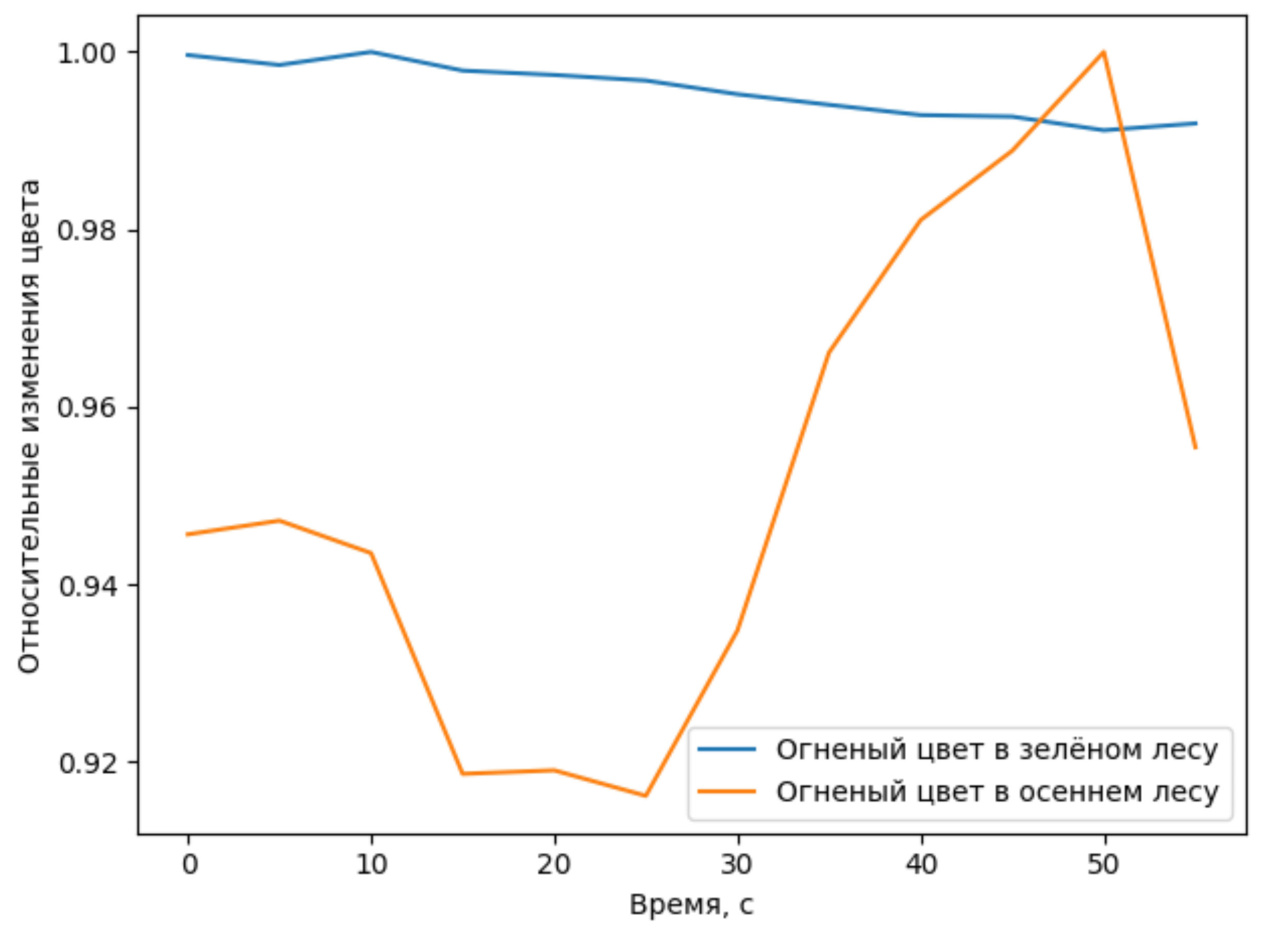 Для исследования динамики изменения пропорционального количества цветов для стационарных камер системы видеонаблюдения тестировалось ряд видеозаписей лесных массивов и отслеживалась динамика наличия «огненных» цветов с промежутком раз в 1 с (рис. 1).
