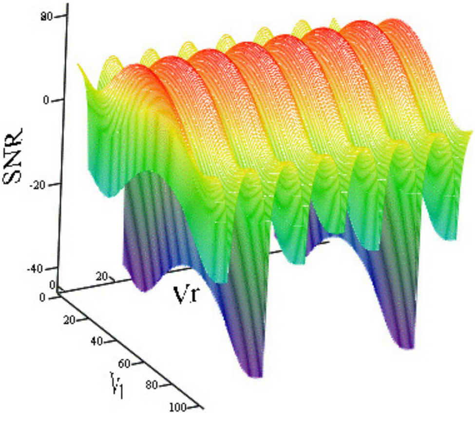 2. Рис. 1. Отношение сигнал – шум в канале СДЦ [дБ] в зависимости от [м/с], [м/с] (на изображении индекс по осям меняется от 1 до 100), при наблюдении цели с ЭПР м2, базе интерферометра 2 м, пространственное разрешение 6 м