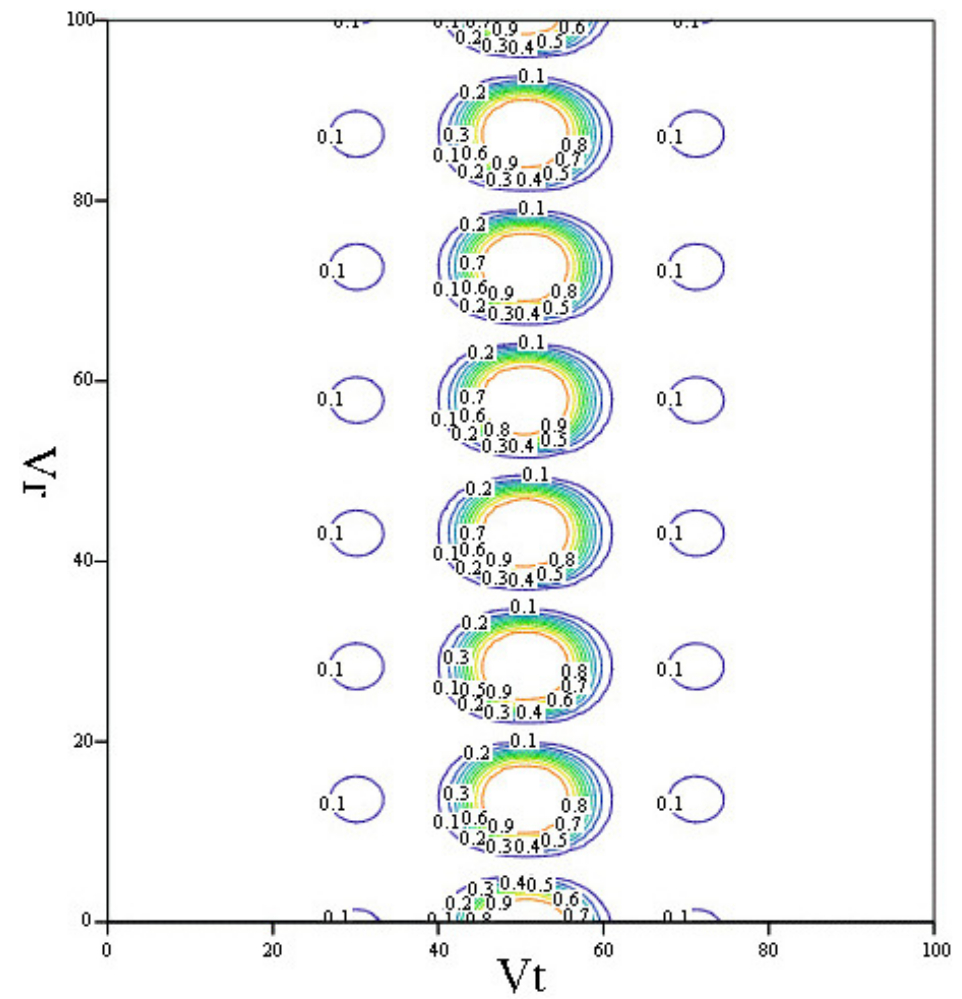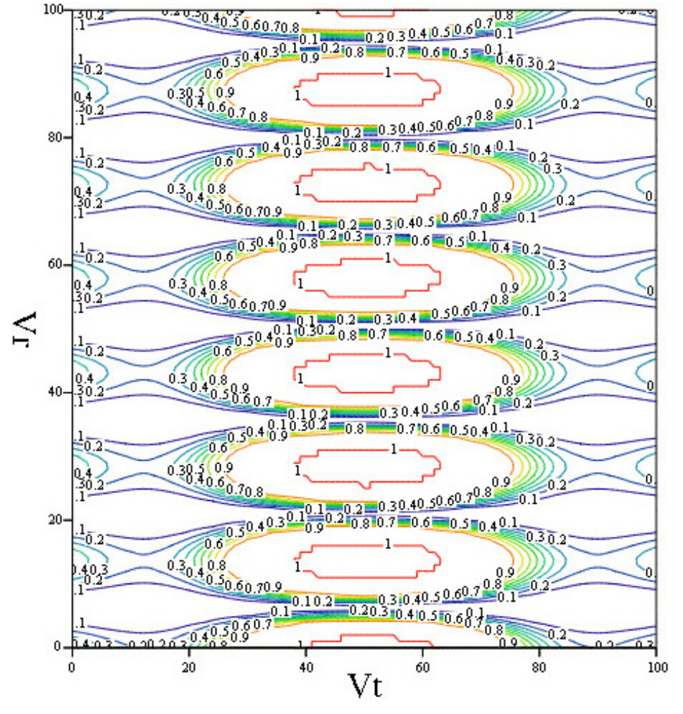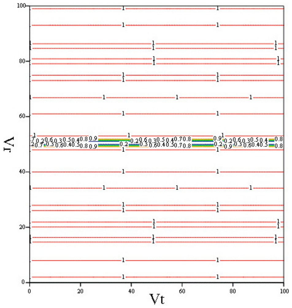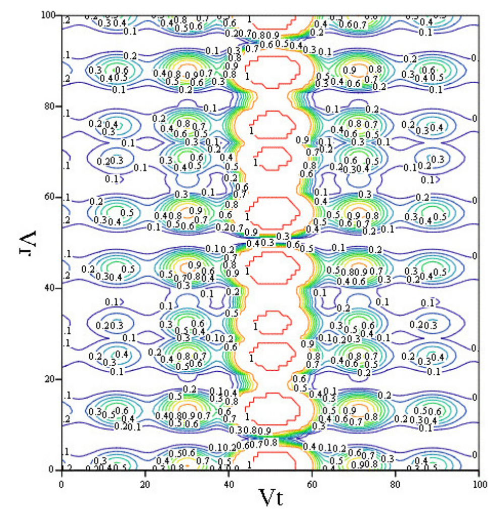 Fig. 5. ρпо depending on Vt[-300,300] [m/s], Vr[-300,300] [m/s] (in the image, the index along the axes changes from 1 to 100), when observing a target with EPR σ=6 m2, the base of the interferometer is 2 m, the spatial resolution is 6 m for the case of simultaneous reception on 2 bases and using the auto focus mode of mobile targets
