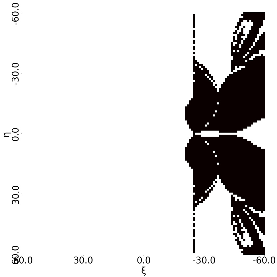 Рис. 2. Пример «слепой зоны» точек для вычисления стационарной фазы. Черным обозначены области, в которых не вычисляется точка стационарной фазы. Для наглядности расстояния измеряются в единицах . При этом использованы следующие параметры: