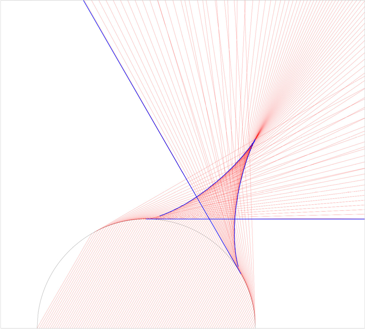 Рис. 5. Каустики шара. Для примера рассмотрен случай с . Тонкими (красными в онлайн-версии статьи) линиями изображены лучи, жирными (синими в онлайн-версии статьи) – вычисленные линии каустик