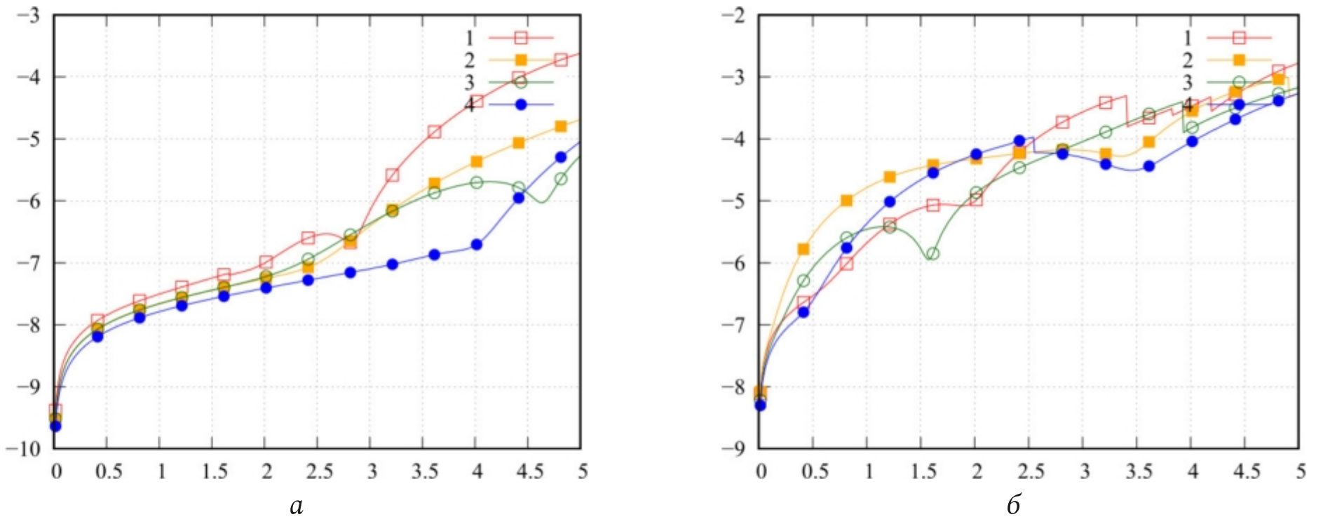 Рис. 2. Зависимость от ; а – ; б – , номер кривой соответствует номеру СЛАУ