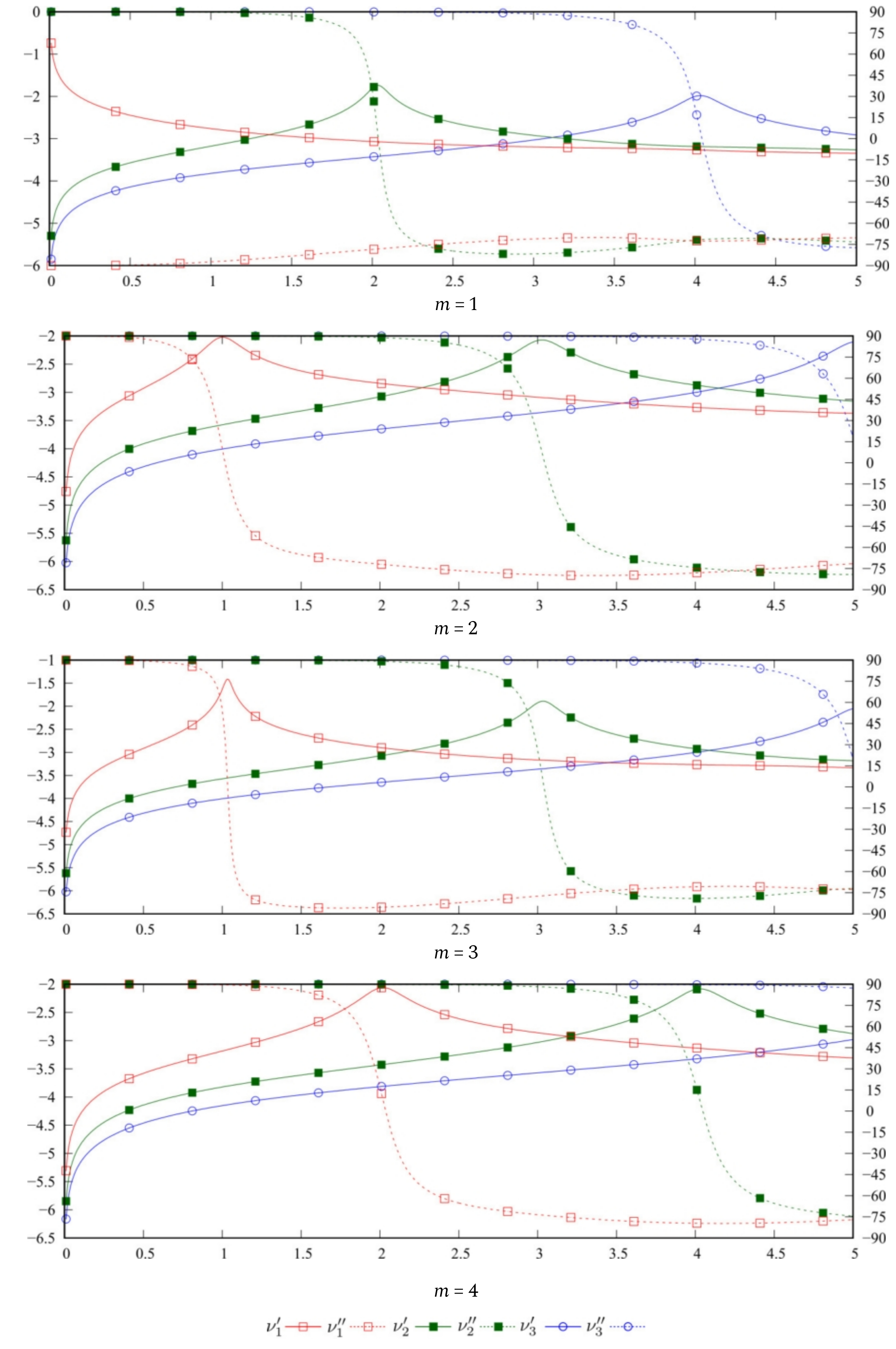 The ratio of the intensities of the real and imaginary parts of the eigenfunctions can be estimated by the magnitude , and the graphs are shown in Fig. 6. In all cases, a general tendency is observed that at small values of x, the intensity of the imaginary part of the eigen functions is small; therefore, the oscillations of the EF point occur almost in-phase. As x increases, the intensity of the real and imaginary parts becomes commensurate, which results in a violation of the in-phase oscillations. In addition, at large values of x, there are points at which the intensity of the EF imaginary part is tens of times greater than that of the real part.