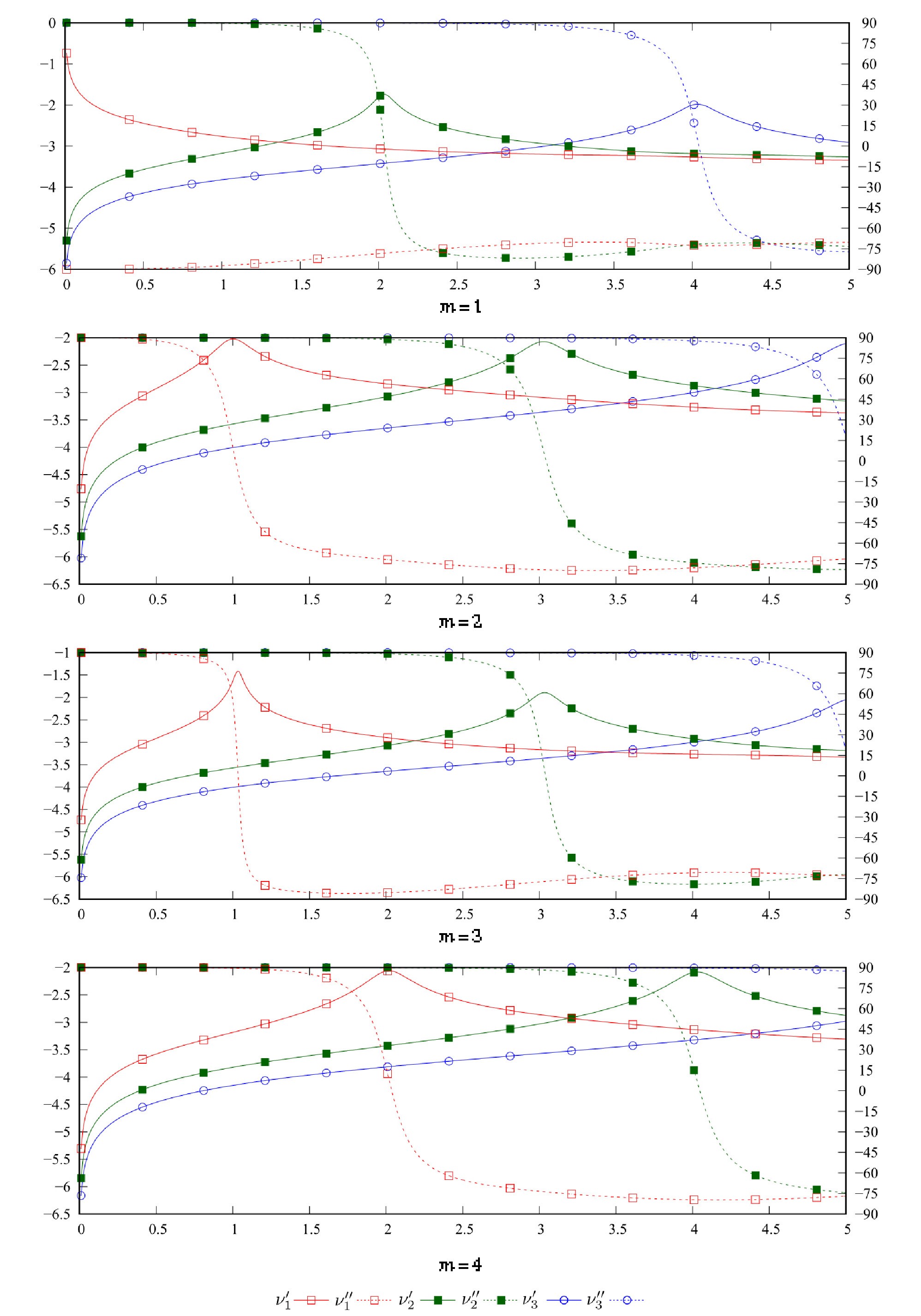 Figure 5 shows the graphs of the real and imaginary parts of the first four eigenfunctions calculated at . It can be observed that they correspond to the conditions of Eq. (8). It is clear that EF can be approximated by rapidly converging series of trigonometric functions. It can also be noted that for , the function has a uniform distribution, and for , the uniformity is violated, and its maximum shifts to a point with a smaller radius of curvature.