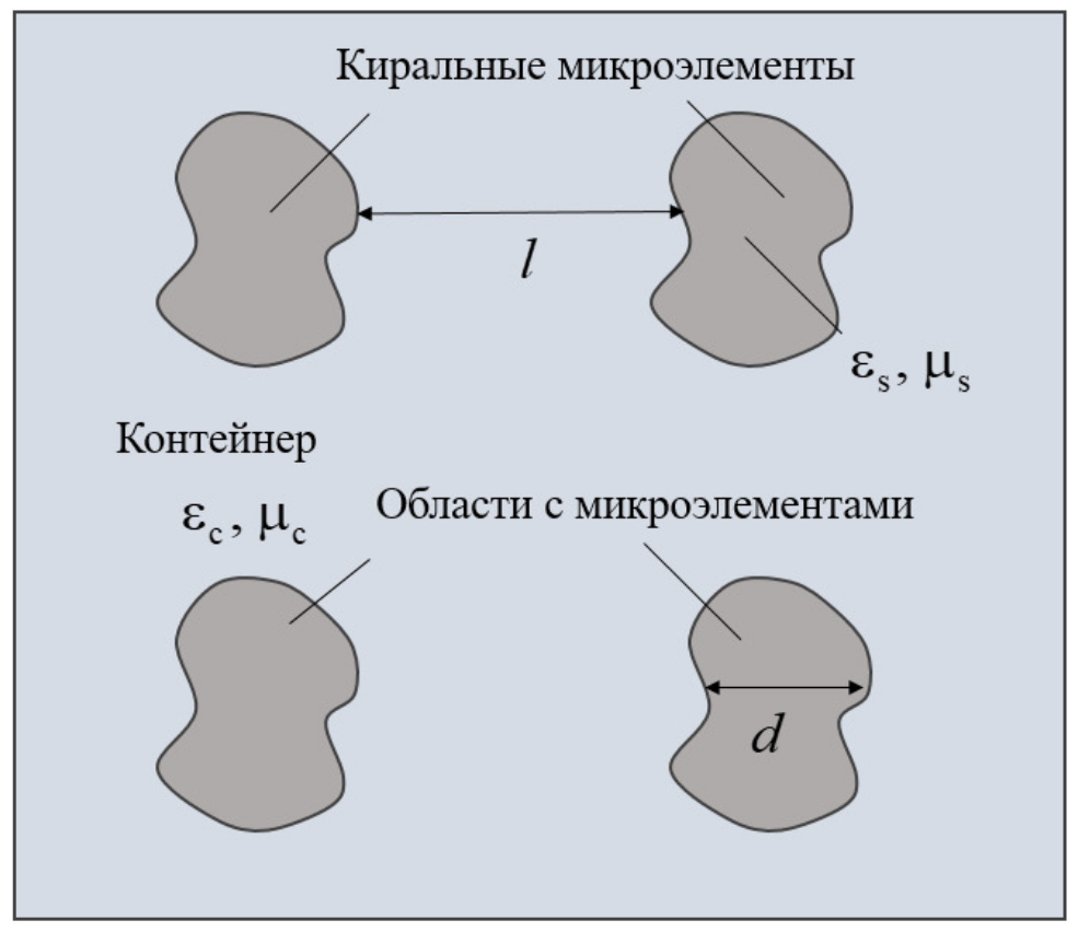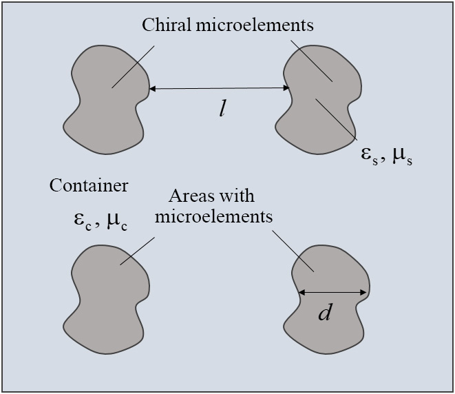 Let us delve into the structure of a metamaterial consisting of a dielectric container with relative dielectric and magnetic permeabilities , where mirror-like asymmetric conductive microelements are placed. The regions inhabited by these mirror-like asymmetric elements possess relative dielectric and magnetic permeabilities . The linear dimensions of these regions are denoted by d and l represents the distance between adjacent elements. A general block diagram of the CMM is presented in Fig. 1.