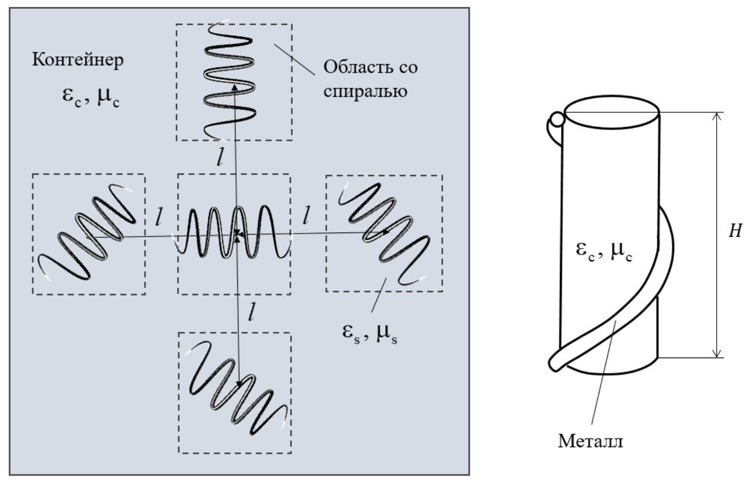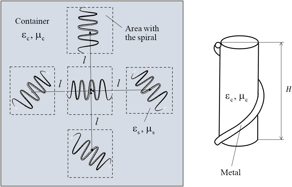 – area of space filled with spirals; r is the wire radius; l is the distance between chiral elements; is spiral winding angle. The coefficient 1 / 4 is related to the spatial arrangement of the chiral elements in the container.