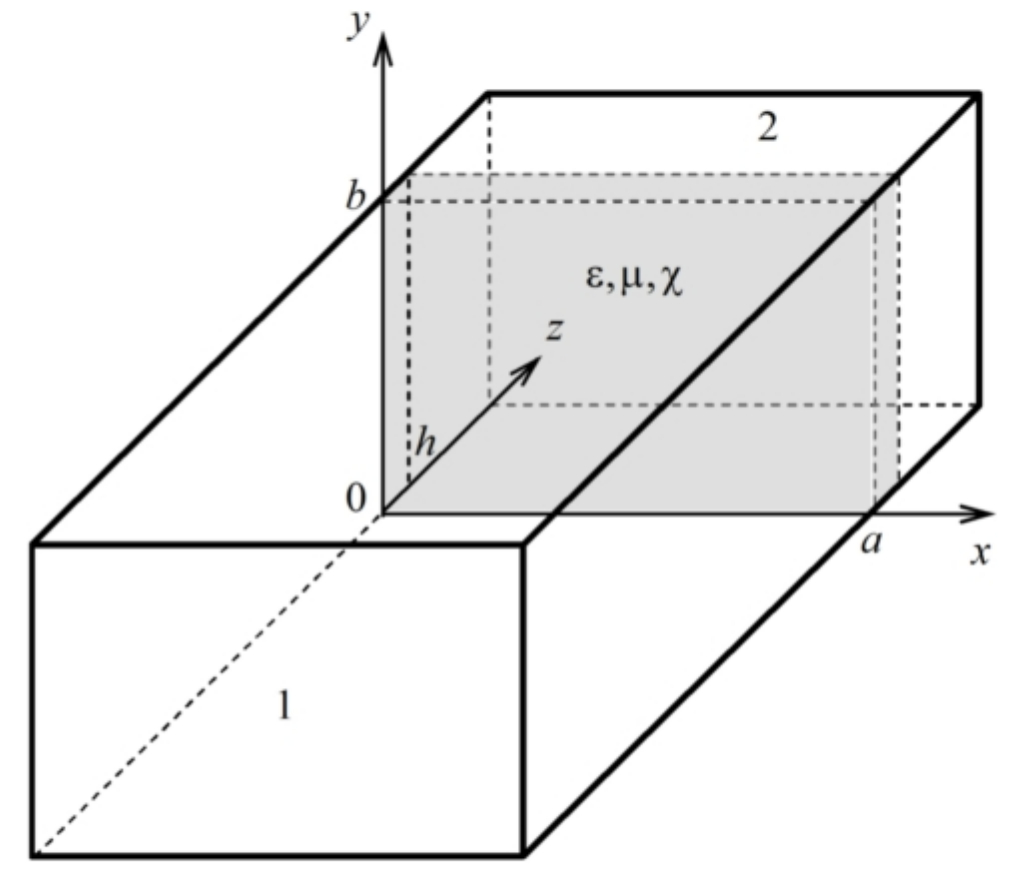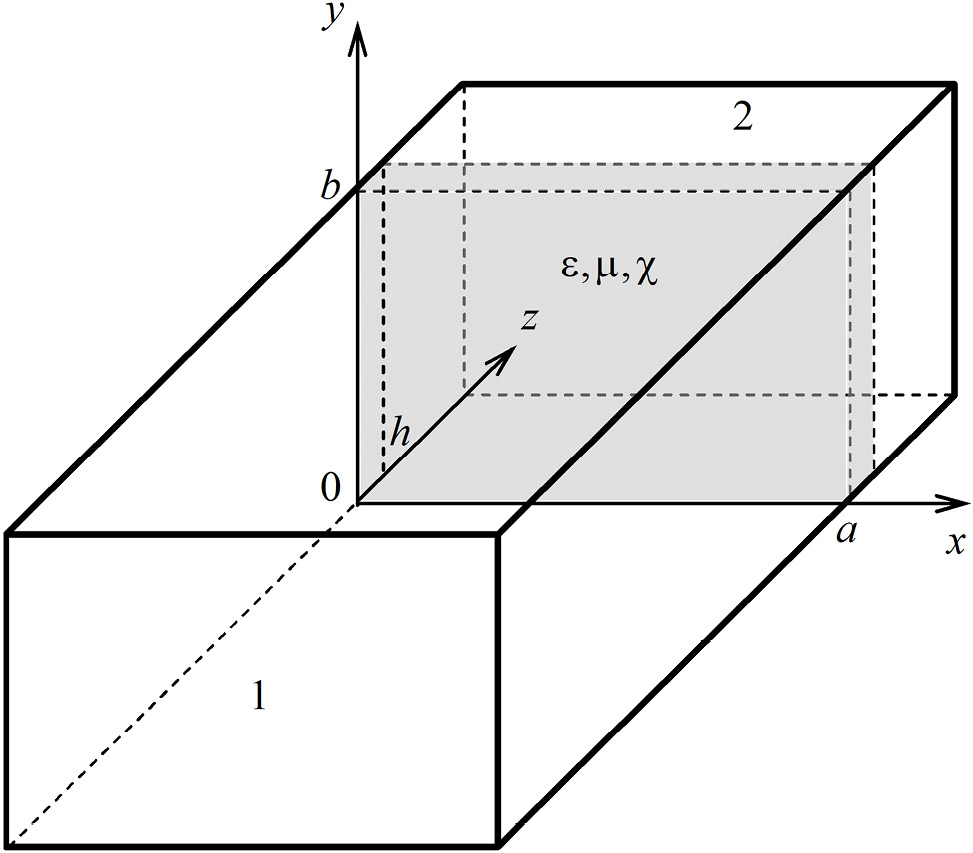 This study addresses the issue of H10 wave diffraction in a rectangular waveguide on a thin chiral layer, located perpendicular to the power transmission direction. The geometry of the problem is presented in Fig. 4.