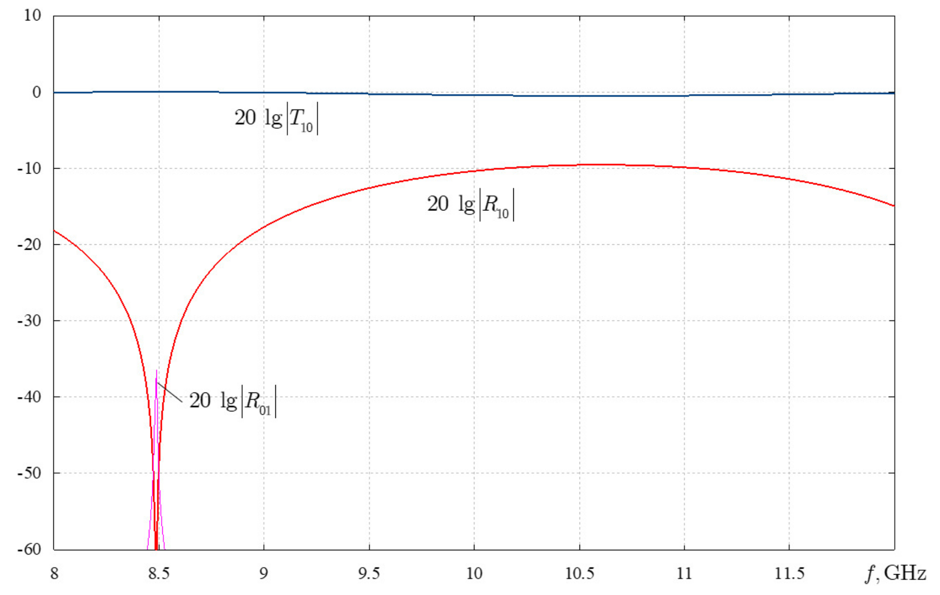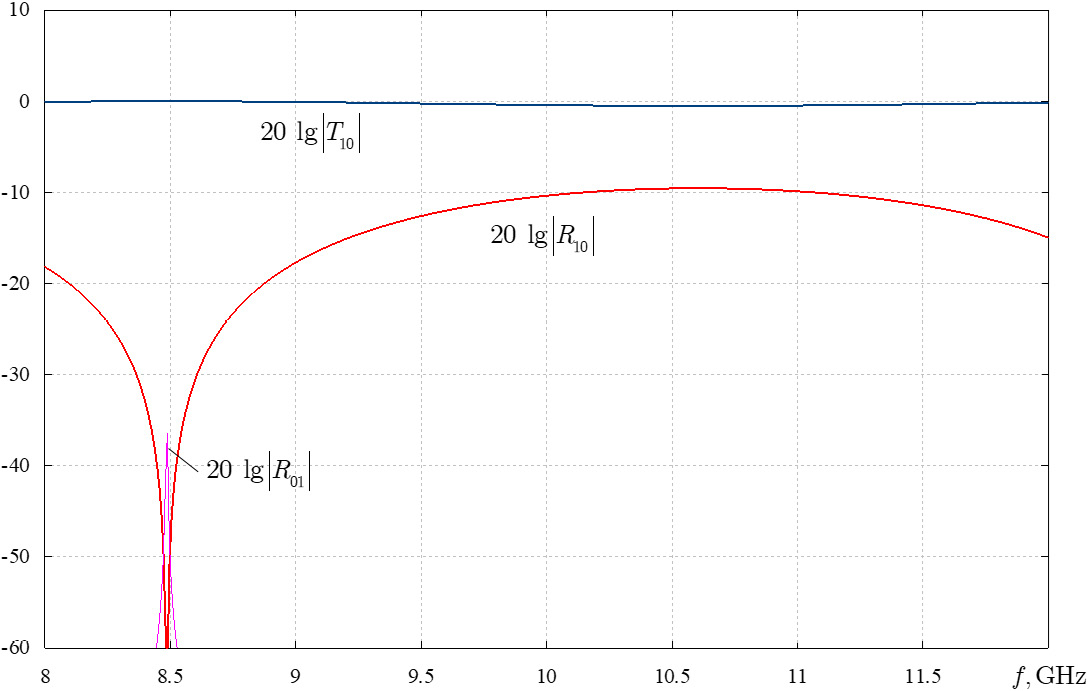 where is the wave H10 propagation constant in a rectangular waveguide with vacuum filling; and are unknown wave H10 reflection and transmission coefficients, respectively. The amplitude of the incident wave H10 was assumed to be 1.