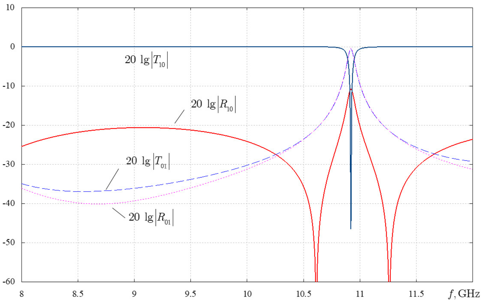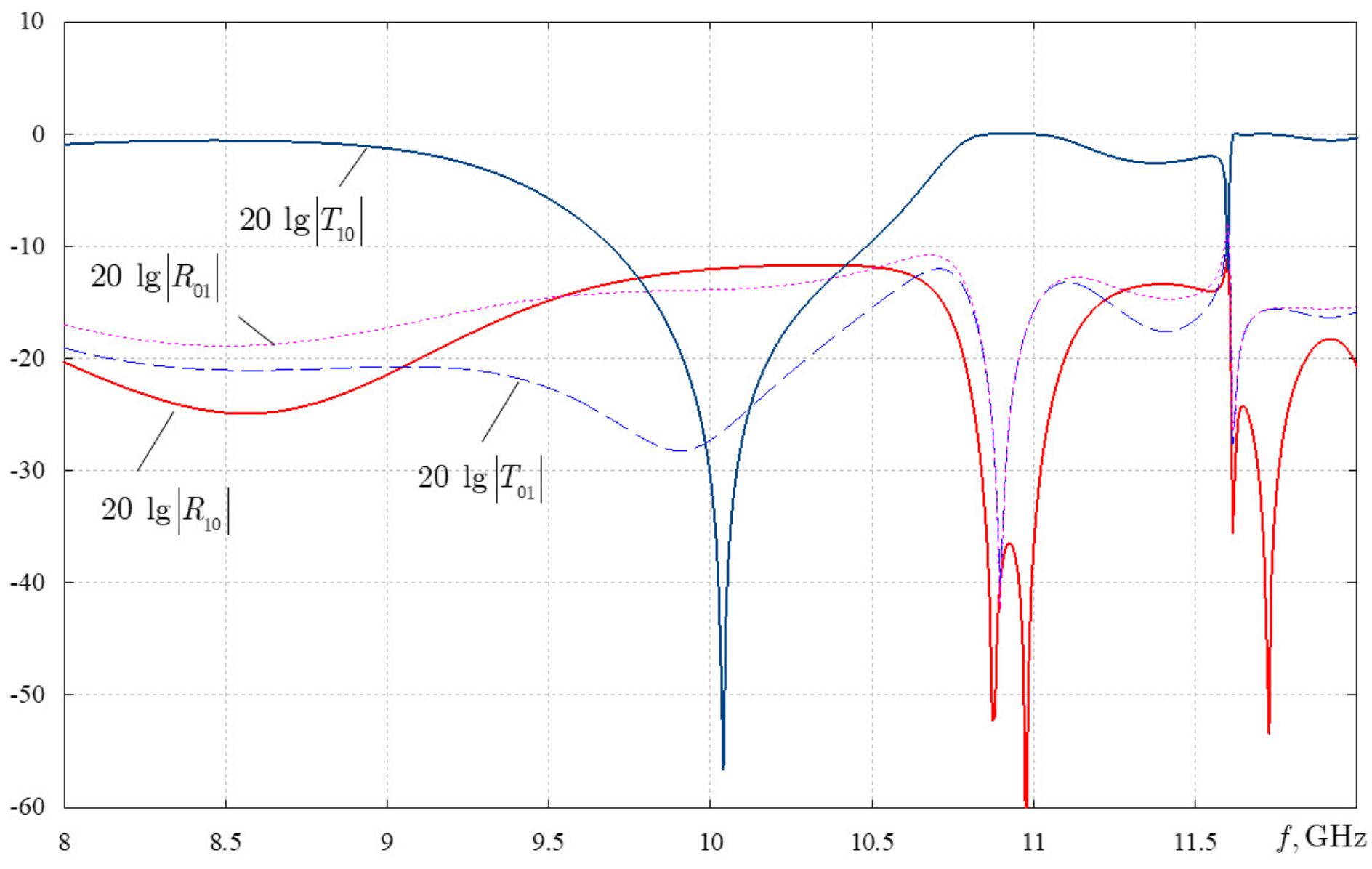 Figure 6 presents the dependencies of the transmitted and reflected wave H10 powers, as well as the transmitted and reflected wave H01 powers, on frequency in the operating mode of a rectangular waveguide at .