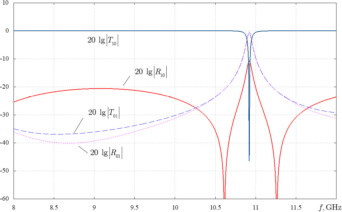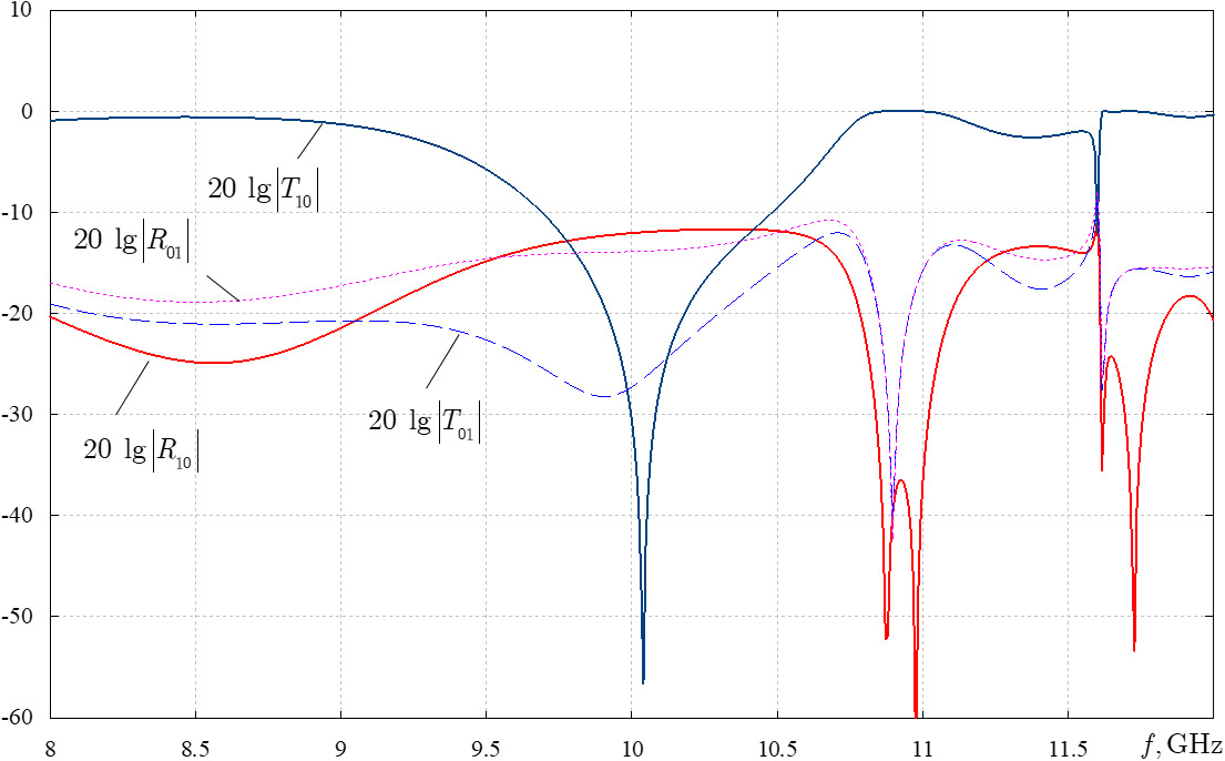 As is obvious from Fig. 6, with two-turn spirals, frequency selectivity arises. Specifically, at a frequency of 10,9 GHz, there is a sharp dip in the transmission of the fundamental wave through the chiral layer in the waveguide. Near this frequency in a rectangular waveguide, wave H01 becomes the fundamental wave because the transmitted and reflected power reaches maxima. The presence of a chiral layer based on two-turn spirals results in the waveguide initially not transmitting the fundamental wave H10 near the resonant frequency, and a shift to the operating mode on the cross-polarized wave H01, which becomes the fundamental one, occurs. In addition, Fig. 6 shows both waves over the entire operating frequency range, although the amplitude of the cross-polarized wave is extremely small (except in the region near the resonant frequency).