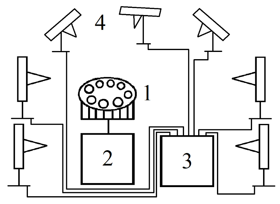 Рис. 2. Схема установки для испытаний. Обозначения: 1 – АР, 2 – ПНП, 3 – ПТ, 4 – излучающие антенны