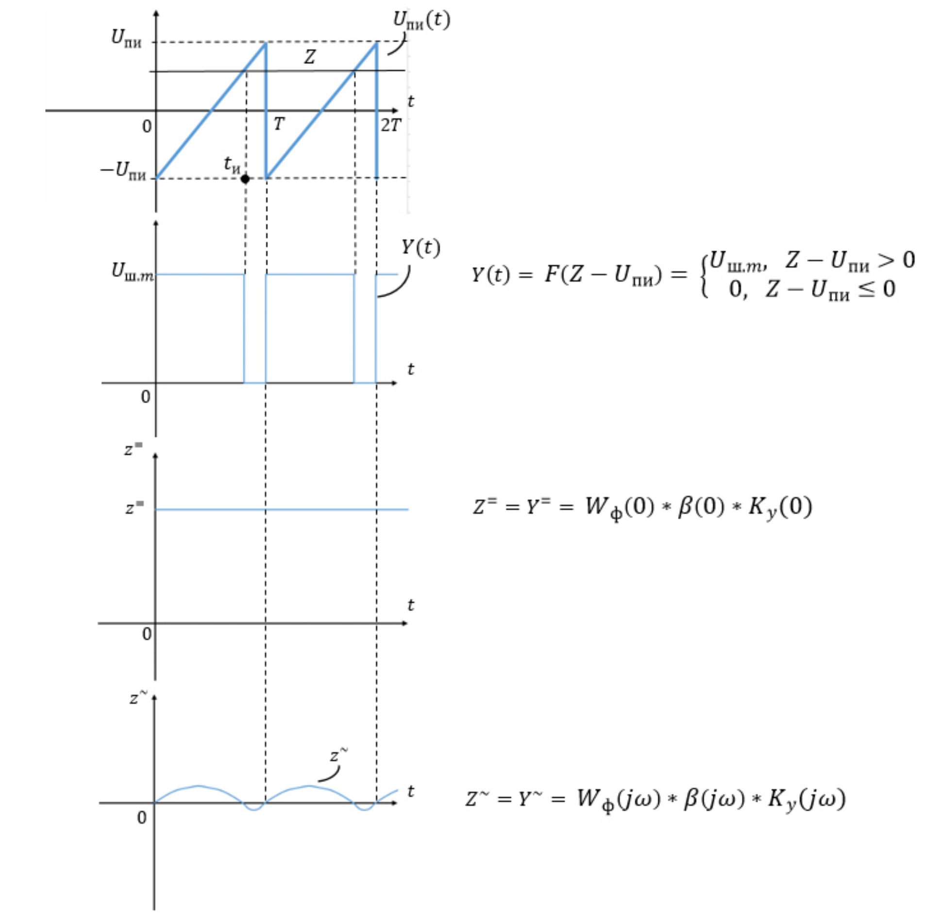 Это уравнение нелинейно, поскольку в него входят изображения нелинейной функции x(t) и нелинейной функции (характеристики) НЭ Если перейти в (6) и (7) от изображения к оригиналам, а для этого достаточно воспользоваться теоремой свертывания, то мы получим уравнения в оригиналах относительно выходной величины z(t):