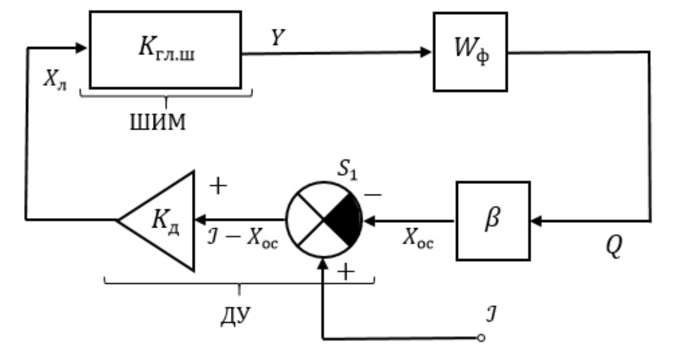 Указанные ограничения, не выполняемые для импульсных преобразователей напряжения, о непрерывности и дифференцируемости функций, описывающих ИПН, и о малых отклонениях переменных x1, x2, …, xn относительно проектируемого режима могут быть сняты, если вместо разложения характеристик нелинейных элементов ПН с разрывами первого рода в степенной ряд Тейлора использовать тригонометрический ряд Фурье и определить условия, при которых об устойчивости исходной нелинейной системы можно было бы судить по ее гармонически линеаризованным моделям. Суть метода гармонической линеаризации состоит в том, что, если в системе с ООС (рис. 2, 3) линейная часть (ЛЧ) обладает фильтрующими свойствами, такими, что высшими гармониками сигнала на выходе ЛЧ можно пренебречь, тогда нелинейный элемент (НЭ) в системе (рис. 2, 3) можно заменить гармонически линеаризованным звеном с коэффициентом передачи НЭ только по первой гармонике КГЛ (рис. 3). Затем, при анализе устойчивости воспользоваться линейными частотными критериями, в первую очередь – частотными критериями Найквиста и Боде. Замена реального НЭ элементом с коэффициентом передачи по первой гармонике его выходного сигнала при выполнении в системе условия малости высших гармоник на выходе линейной части системы, т. е. выполнения известного в литературе условия как «гипотеза фильтра», корректна и применима к функциям с разрывами первого рода, которыми описываются процессы преобразования электроэнергии и протекающие электромагнитные процессы в ИПН.
