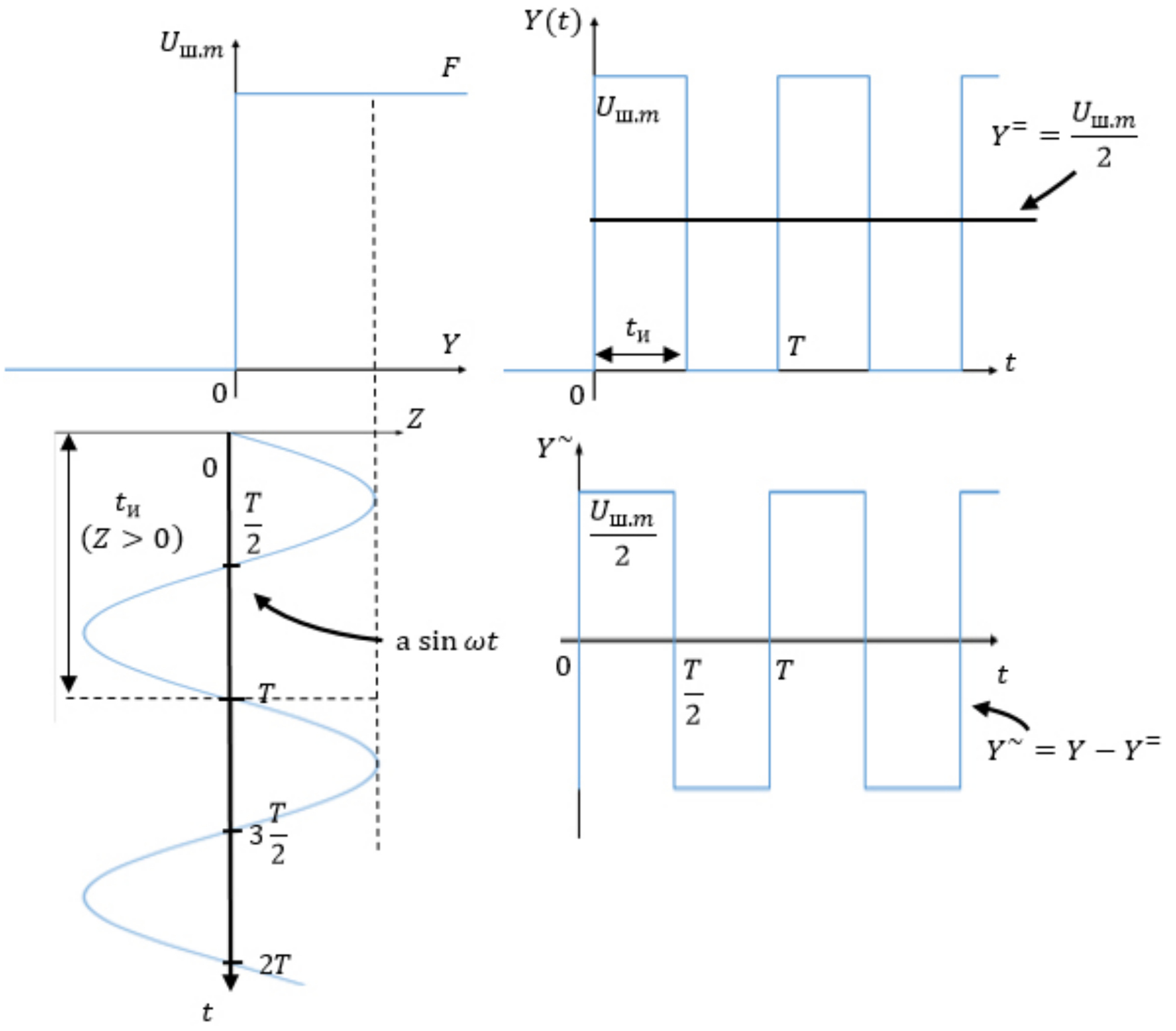 Внешнее воздействие f(t) приложено по входу нелинейного элемента. Выходная величина нелинейного элемента y(t) зависит от значения входного сигнала x(t) и уравнения характеристики нелинейного элемента и может быть представлено в виде: