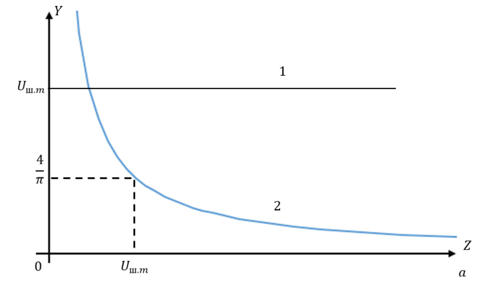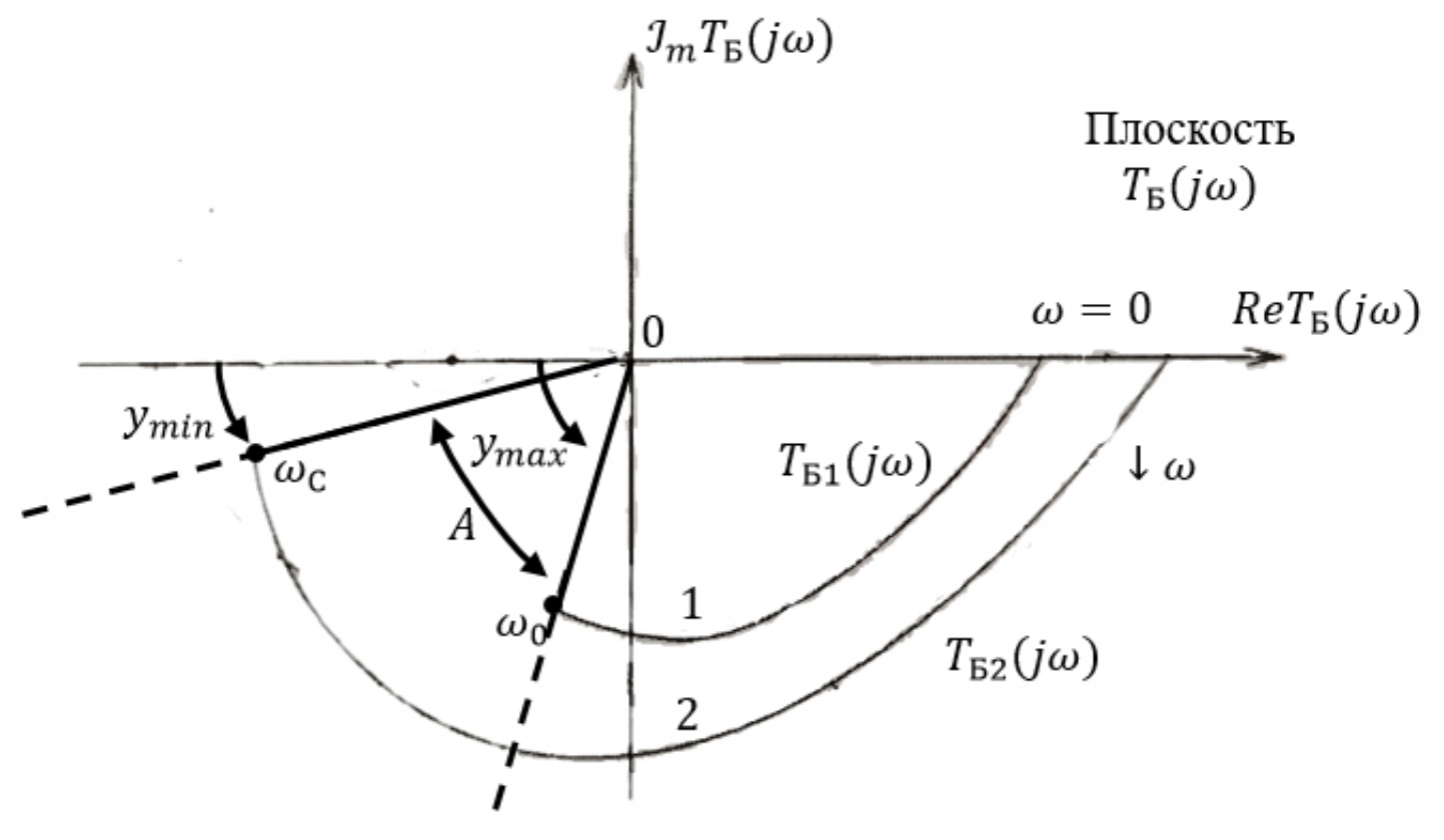 Рис. 12. Графическая иллюстрация условий (36) на плоскости 1 – – функция Боде с запасом по фазе ymax = 75°; 2 – – функция Боде с запасом по фазе ymax = 15°; A – область плоскости где выполняются условия (36) (угол допустимых значений
