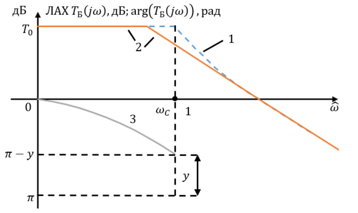 Рис. 13. Частотные характеристики 1 – ЛАХ типа идеальный срез по Боде, дБ; 2 – асимптотические прямые ЛАХ, дБ; 3 – рад;