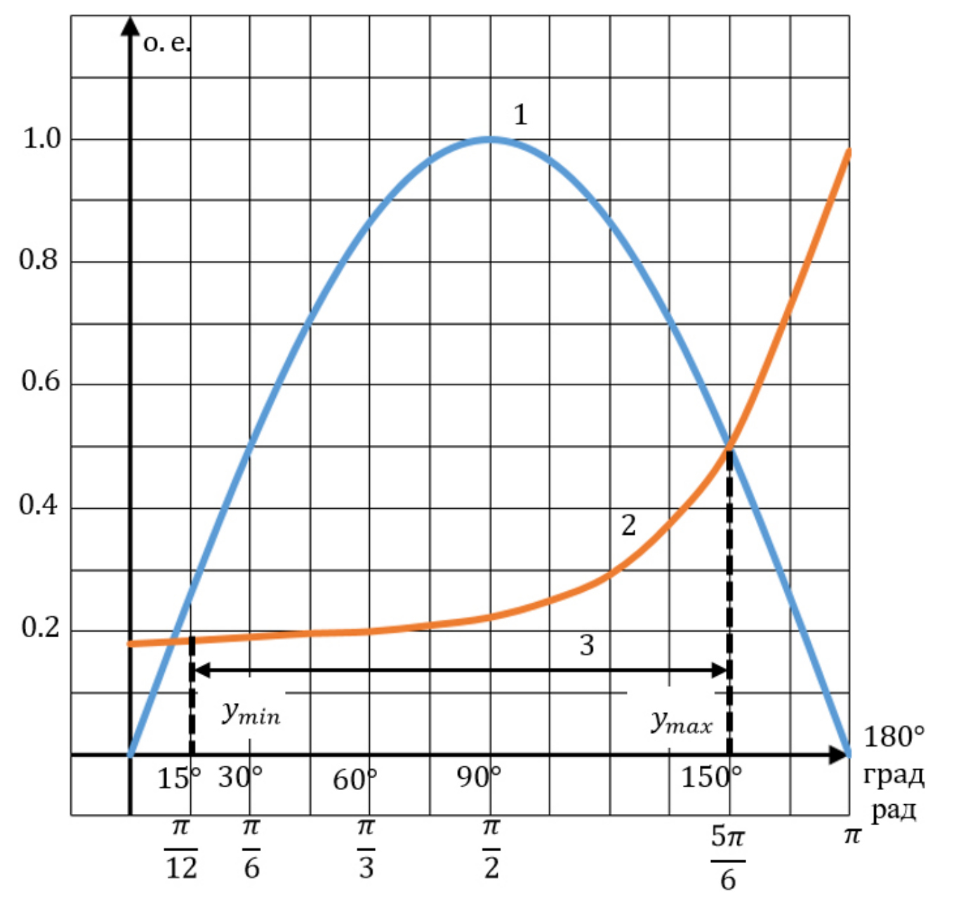 Fig. 14. Graphic solution to inequality (34): 1 – function f1(y) = sin y; 2 – 3 – inequality solution interval (34)
