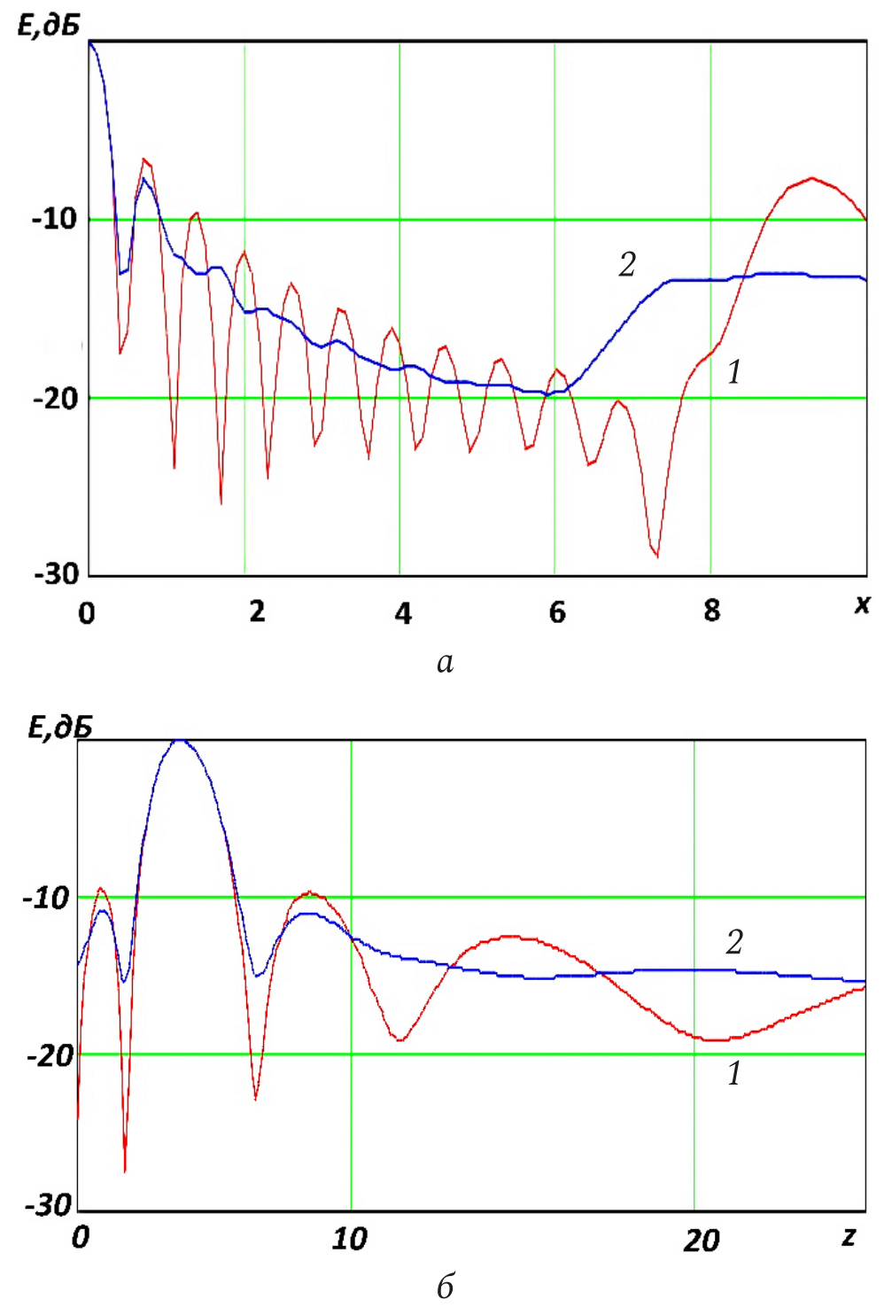 Основные свойства электромагнитных полей, сфокусированных по монохроматическому сигналу, к настоящему времени изучены достаточно подробно. Введены или уточнены характеристики и параметры сфокусированных полей (КНД, размеры сфокусированной области, уровни боковых лепестков) и установлена их зависимость от характера апертурного распределения и положения точки фокусировки [5]. Выявлены новые свойства электромагнитных полей и предложено их использование для повышения точностных показателей в диагностических задачах [6–7].