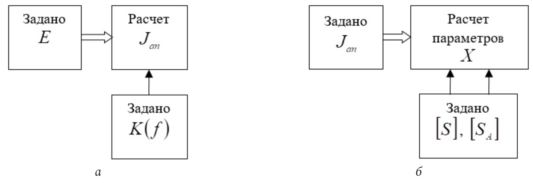 Рис. 2. Синтез параметров антенн для случая монохроматического сигнала. Этап 1. Синтез апертурного распределения (а), Этап 2. Расчет параметров антенны (б)