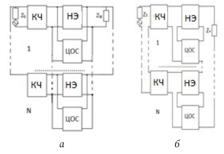 При этом учитывалось, что НЧ состоит из трехполюсного нелинейного элемента (НЭ) и охватывающей его цепи обратной связи (ЦОС ‑ параллельной или последовательной по току или напряжению). Оптимизация параметров двухполюсников, не входящих в КЧ, осуществляется с помощью известных численных методов [10] по критерию обеспечения заданной рабочей полосы частот. Все обозначения неописанных величин в данной статье соответствуют принятым в [9].