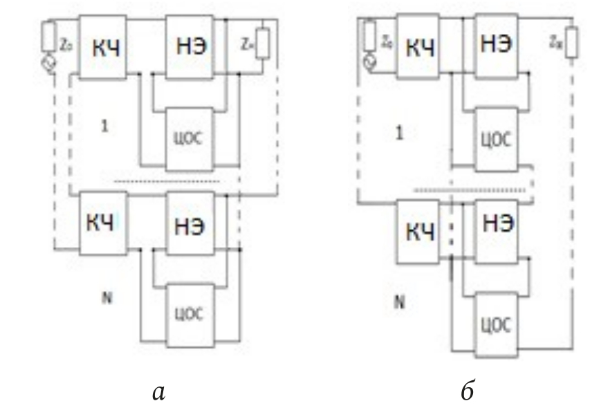 В данной работе предлагается рассмотреть особенности этих алгоритмов с учетом наличия каскадов типа «комплексный четырехполюсник (КЧ) – нелинейная часть (НЧ)». Эти каскады включены между источником сигнала с сопротивлением и нагрузкой (рис. 1, 2).