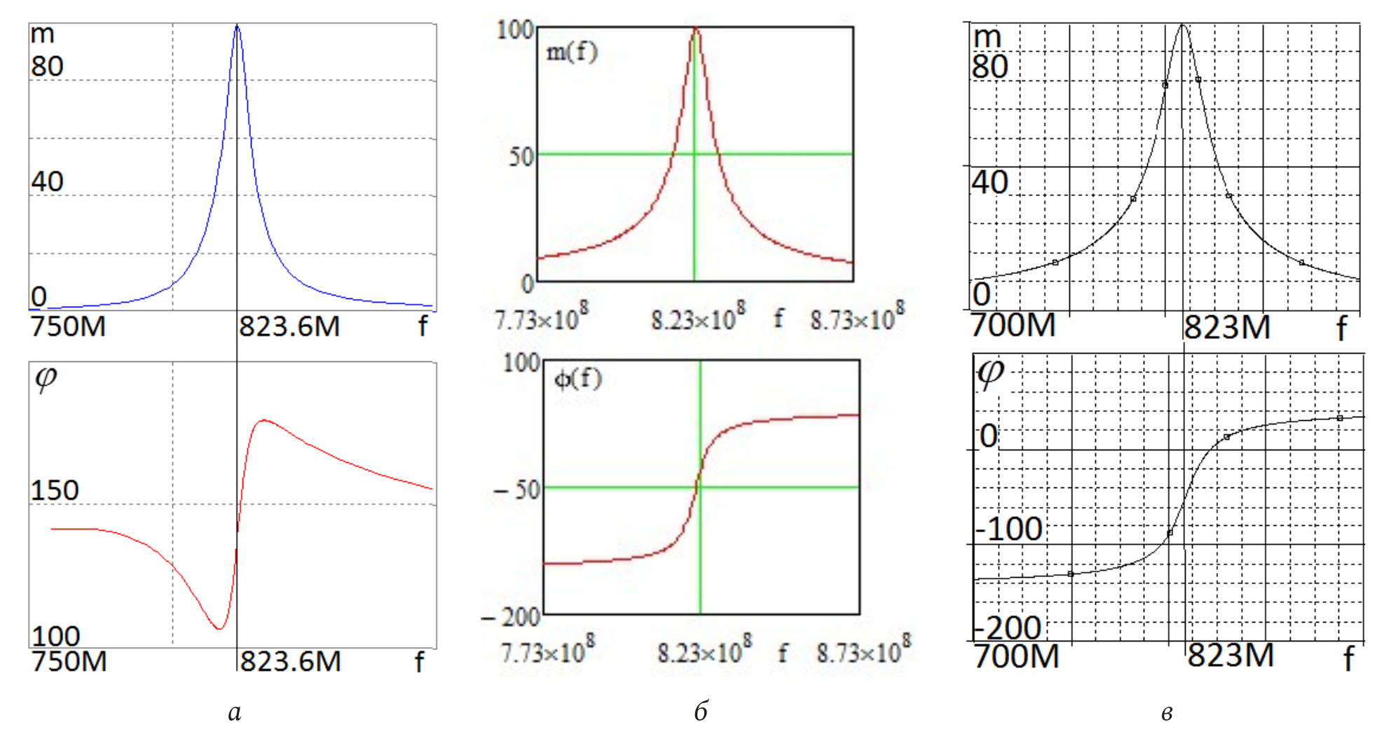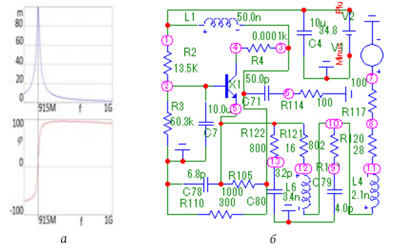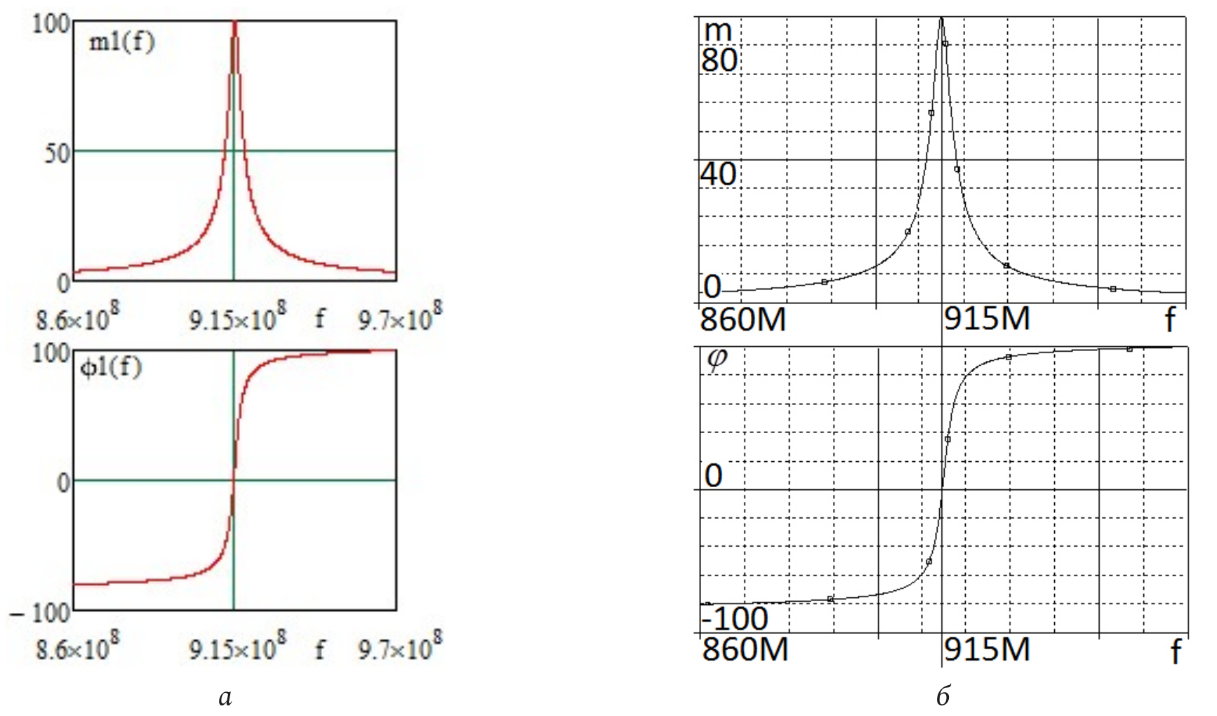 Средняя частота эквивалентной схемы ƒ ≈ 915 МГц (рис. 9, а и б) совпадает со средней частотой принципиальной схемы (рис. 6, б).
