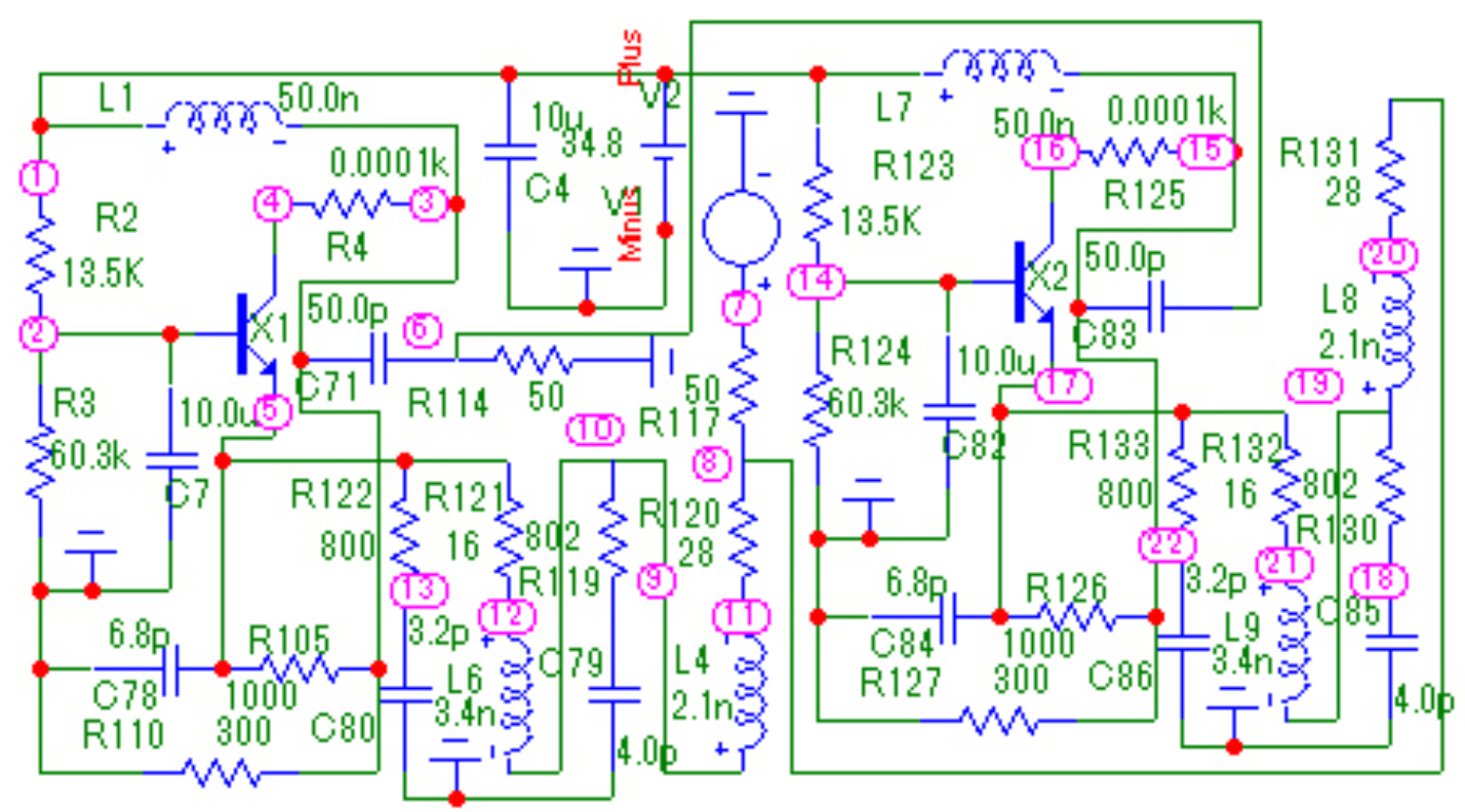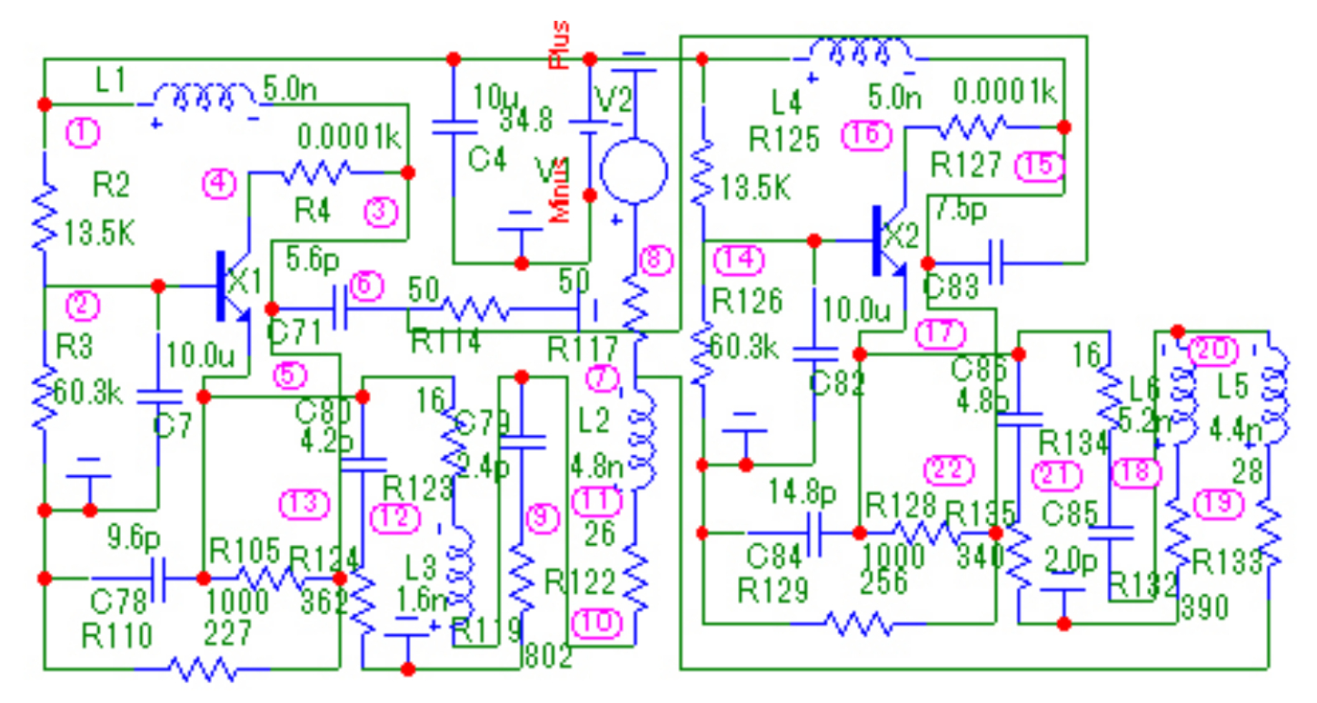 Рис. 11. Эквивалентная схема двухкаскадного усилителя (рис. 10) с неодинаковыми каскадами, соответствующая структурной схеме (рис. 1, а), исследуемая в системе OrCad