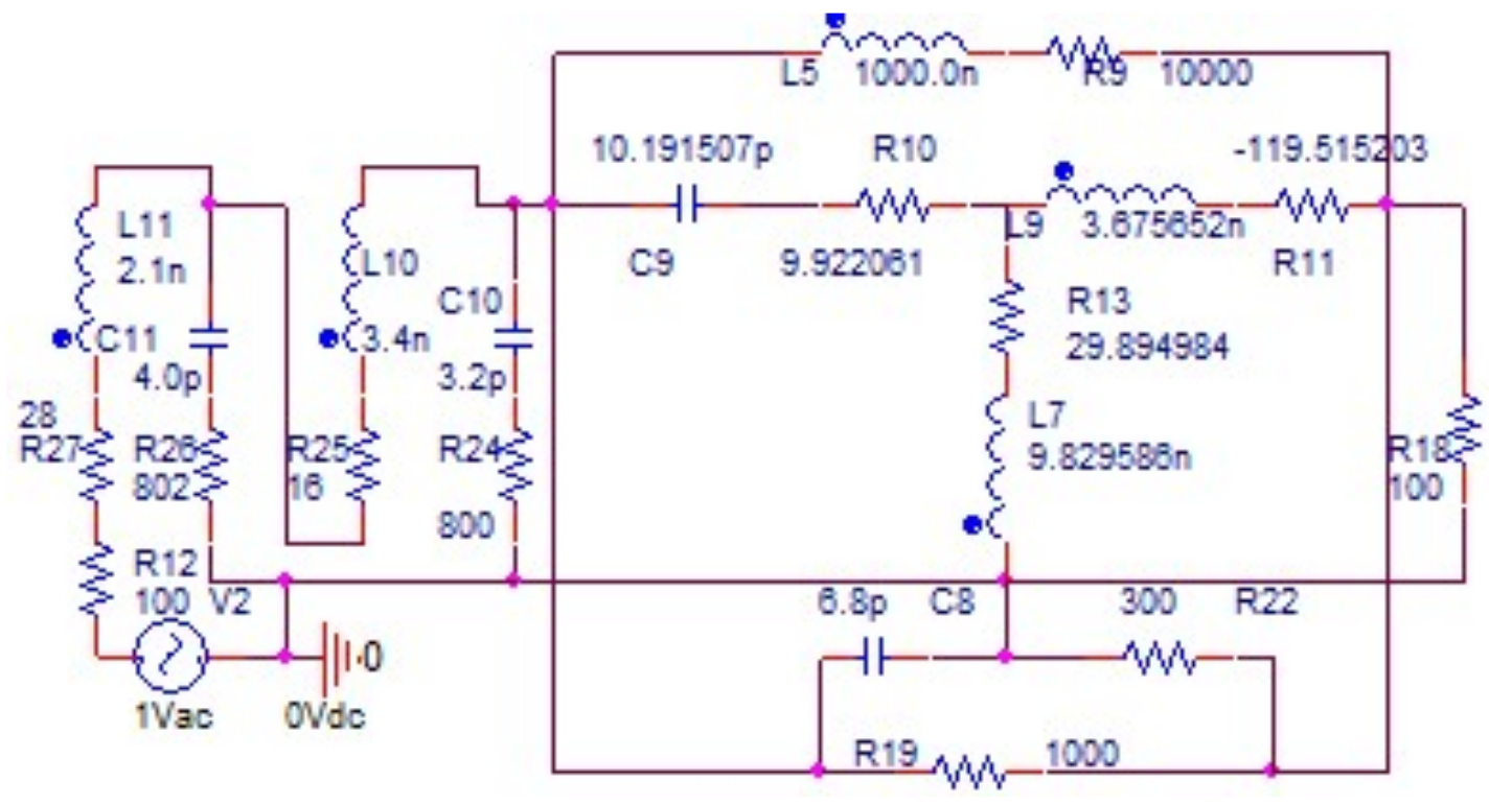 Эквивалентная схема нелинейного элемента выполнена в виде перекрытого Т-образного четырехполюсника на элементах рис. 8). Параметры эквивалентной схемы НЭ выбраны из условия совпадения выходного сопротивления НЧ с выходным сопротивлением НЧ с использованием реального транзистора [9]. Схема НЧ реализована в виде параллельно-соединенных эквивалентной схемы нелинейного элемента и цепи обратной связи из П-образного соединения трех элементов