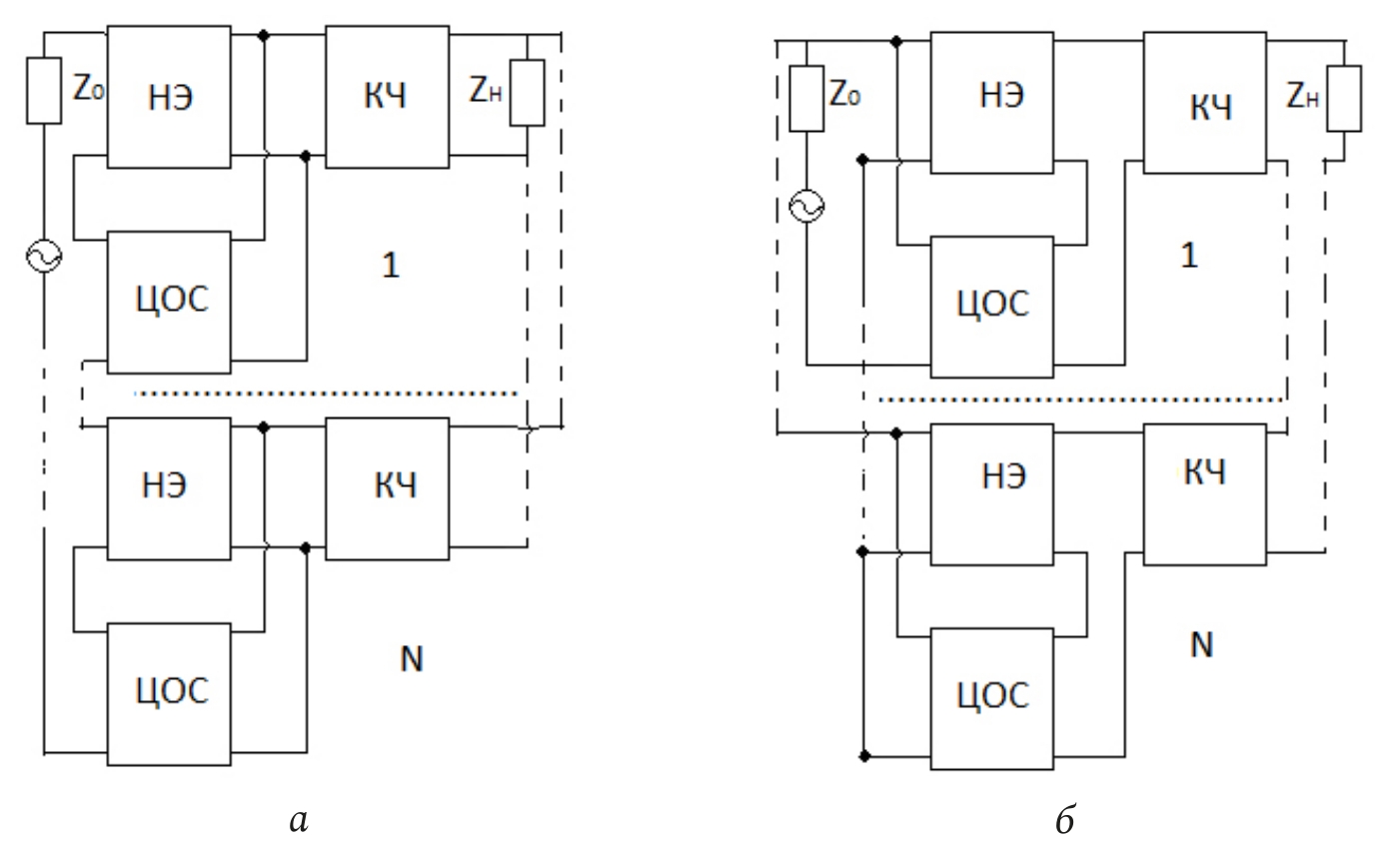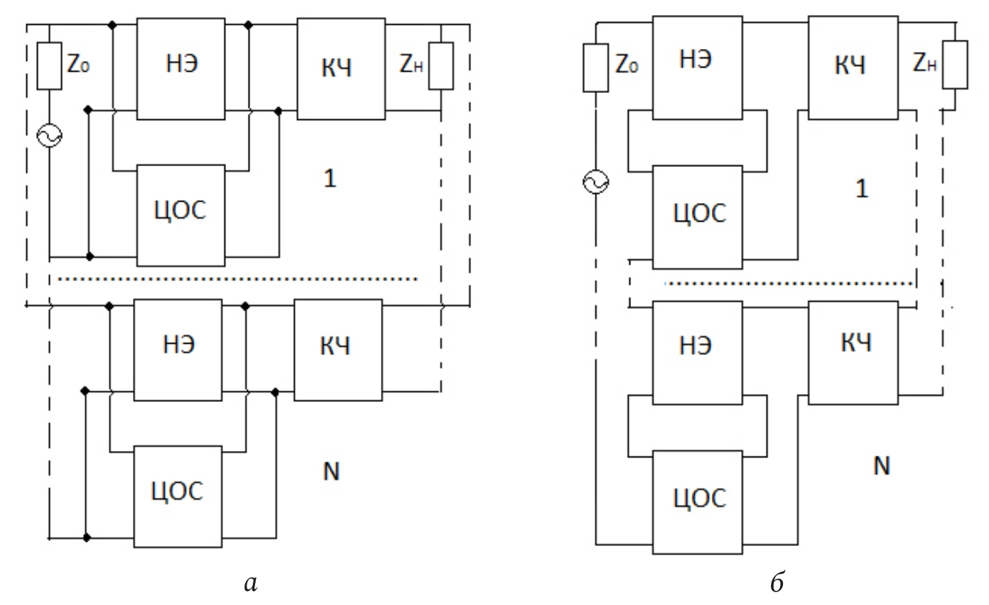 Рис. 2. Структурные схемы многокаскадных радиоустройств с последовательной по напряжению (а) и параллельной по току (б) ЦОС, включенными между источником сигнала и КЧ