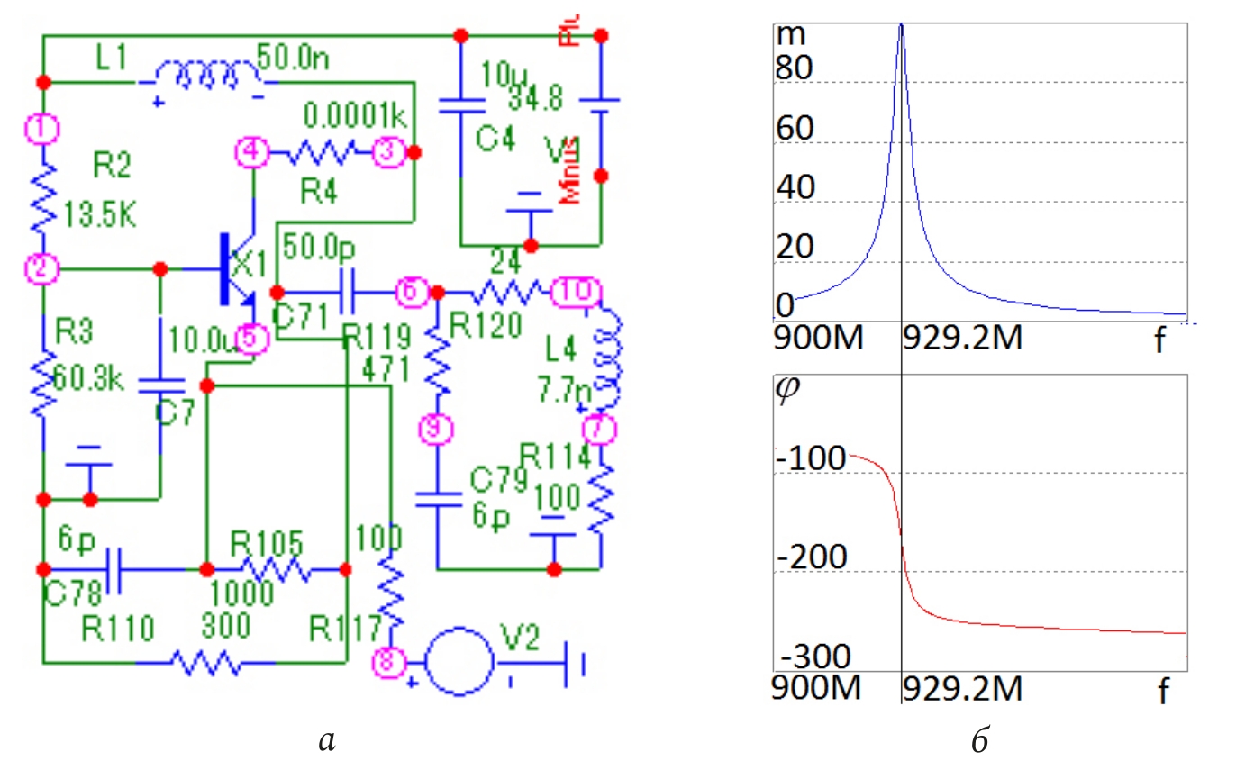 Fig. 6. Schematic diagram of a single-stage amplifier (a), corresponding to the block diagram (Fig. 1, a), at a voltage of U =34,8 V, frequency response and phase response (b), studied in the MicroCap system