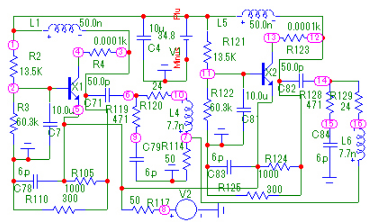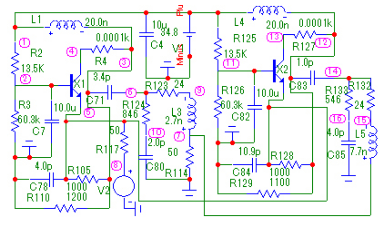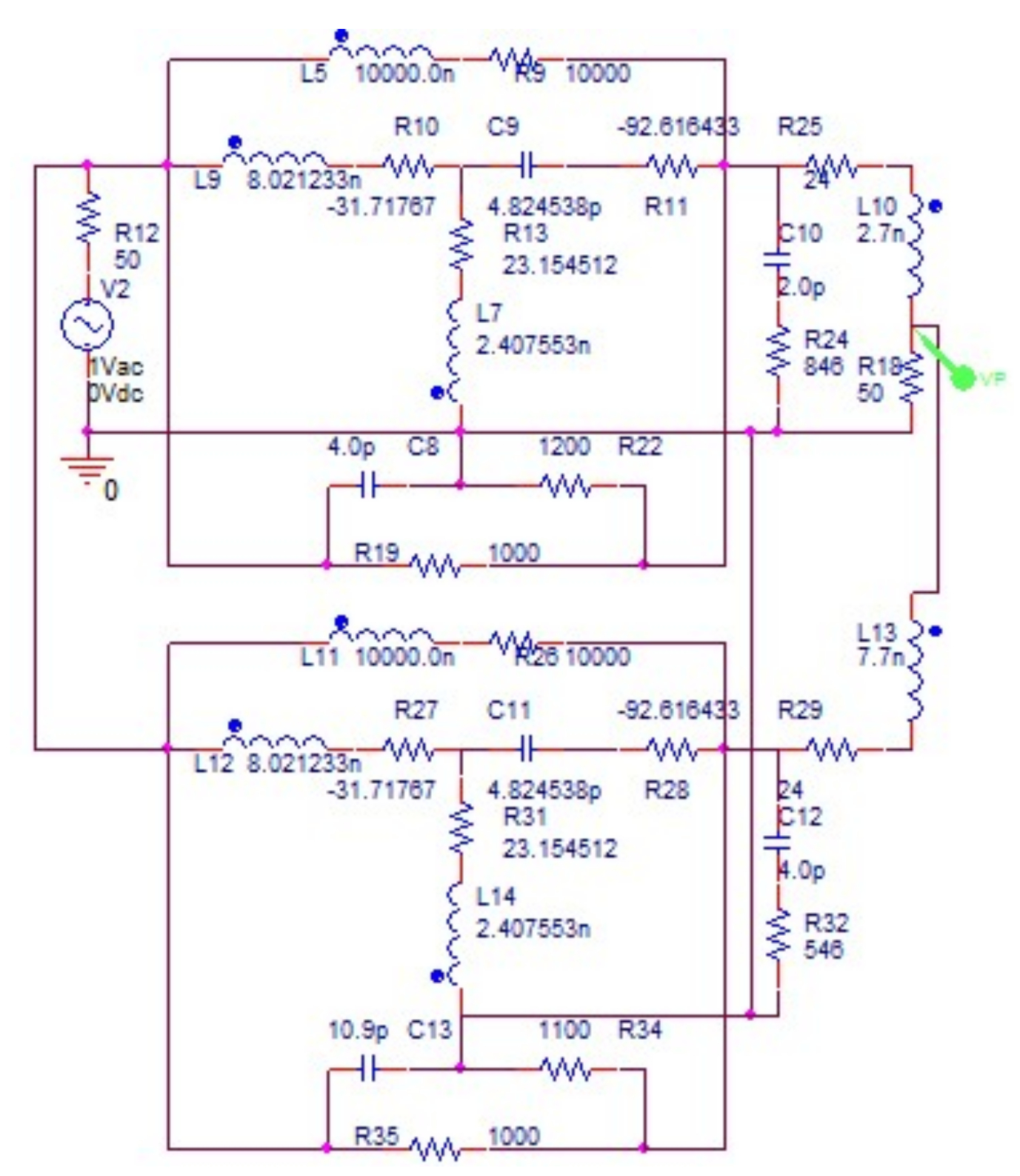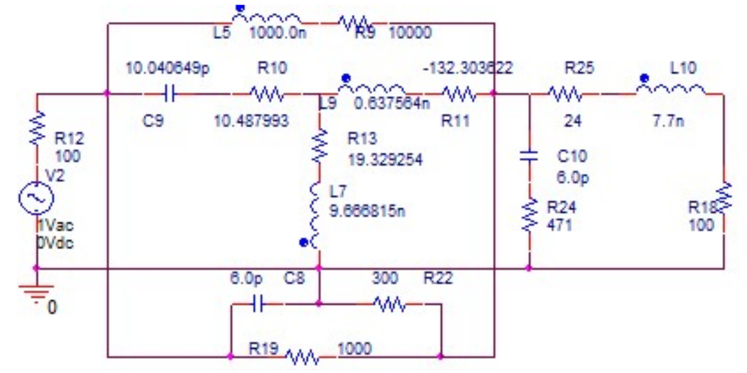 Эквивалентная схема нелинейного элемента выполнена в виде перекрытого Т-образного четырехполюсника на элементах R10, C9, R13, L7, R11, L9, R9, L5. (рис. 8). Параметры эквивалентной схемы НЭ выбраны из условия совпадения выходного сопротивления НЧ с выходным сопротивлением НЧ с использованием реального транзистора [9]. Схема НЧ реализована в виде параллельно-соединенных эквивалентной схемы нелинейного элемента и цепи обратной связи из П-образного соединения трех элементов C8, R19, R22. Параметры ЦОС заданы произвольно. Схема КЧ собрана на основе Г-образного соединения четырех элементов R24, R25, L10, C10.