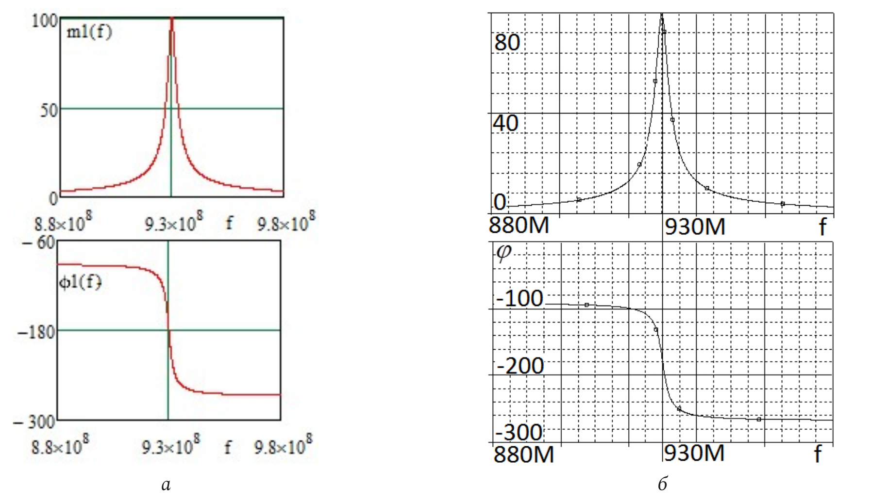 Рис. 9. Частотные характеристики (АЧХ и ФЧХ) эквивалентной схемы (рис. 8), полученные в системе MathCad (а) и OrCad (б)