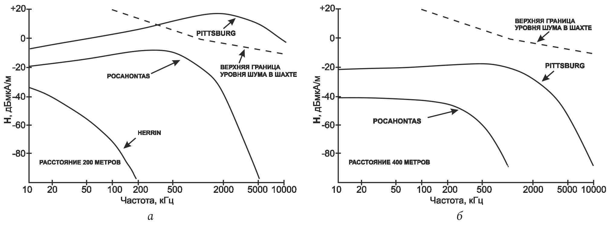 Рис. 1. Зависимости напряженности поля и уровня шумов от частоты для угольных пластов Питтсбурга, Покахонтаса и Херрина (США) на расстоянии (а) 200 м и (б) 400 м [4]
