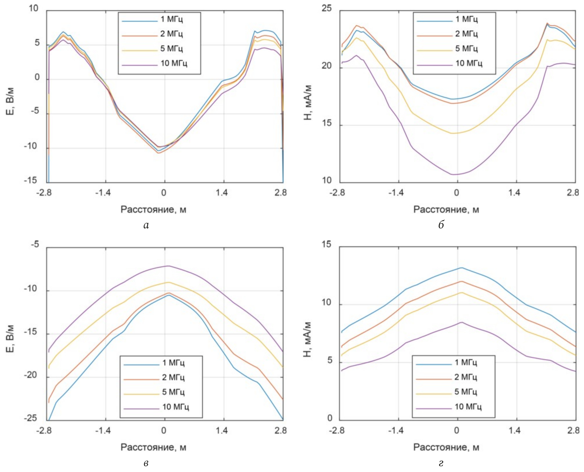 Рис. 5. Зависимость напряженности поля на высоте 1 м на разных частотах для двухпроводной линии (а, б), для однопроводной линии (в, г)