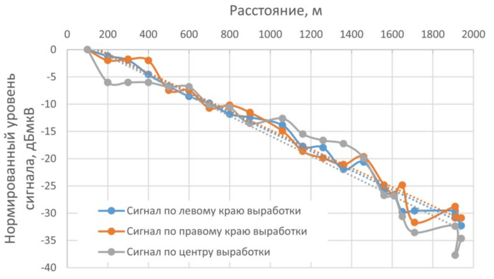 На рис. 6 приведены относительные зависимости нормированного уровня сигнала, измеренные в угольной шахте им. Рубана (Кемеровская область) специалистами НПООО «КВ-СВЯЗЬ» совместно с ВГСЧ МЧС России. Использовалась станция Ferra L1 Ex, согласованная с двухпроводной линией, проложенной вдоль горной выработки в угольном пласте, на частоте 1 МГц в полосе 2,5 кГц. При этом измерения вдоль выработки проводились портативной радиостанцией с мобильной антенной магнитного типа без подключения к линии у левого, правого края выработки и по центру. Измерения проводились весной при высокой влажности породы. В среднем, затухание сигнала составляет 15 дБ на 1 км, что соответствует модели. Таким образом, использование более высоких частот для систем связи с использованием НС не целесообразно.