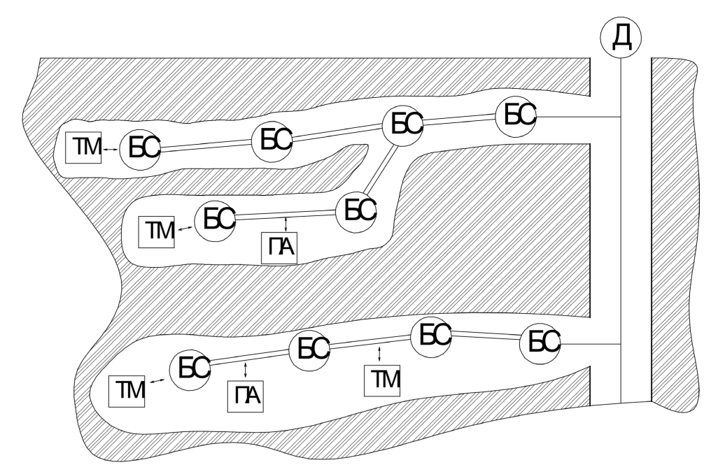 Рис. 7. Участок системы связи с ДНЛ: Д – диспетчерская, БС – базовая станция, ПА – подвижный абонент, ТМ – технологическая машина