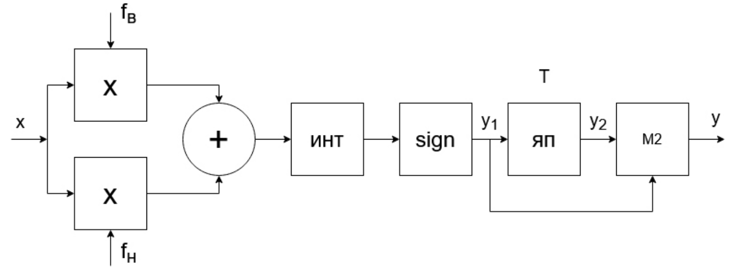 В состав демодулятора входят генераторы сигналов частот fв и fн (на схеме они не показаны), формирующие когерентные с входными сигналами x1(t) и x2(t) колебания. Кроме того, в состав схемы демодулятора входят два перемножителя, сумматор, интегратор, блок sign, ячейка памяти (ЯП) и узел сложения по модулю два (М2) на выходе. На рис. 2 приведены временные диаграммы, поясняющие работу изображенного на рис. 1 демодулятора сигнала МЧМ с числами полупериодов Nн = 2 и Nв = 3.
