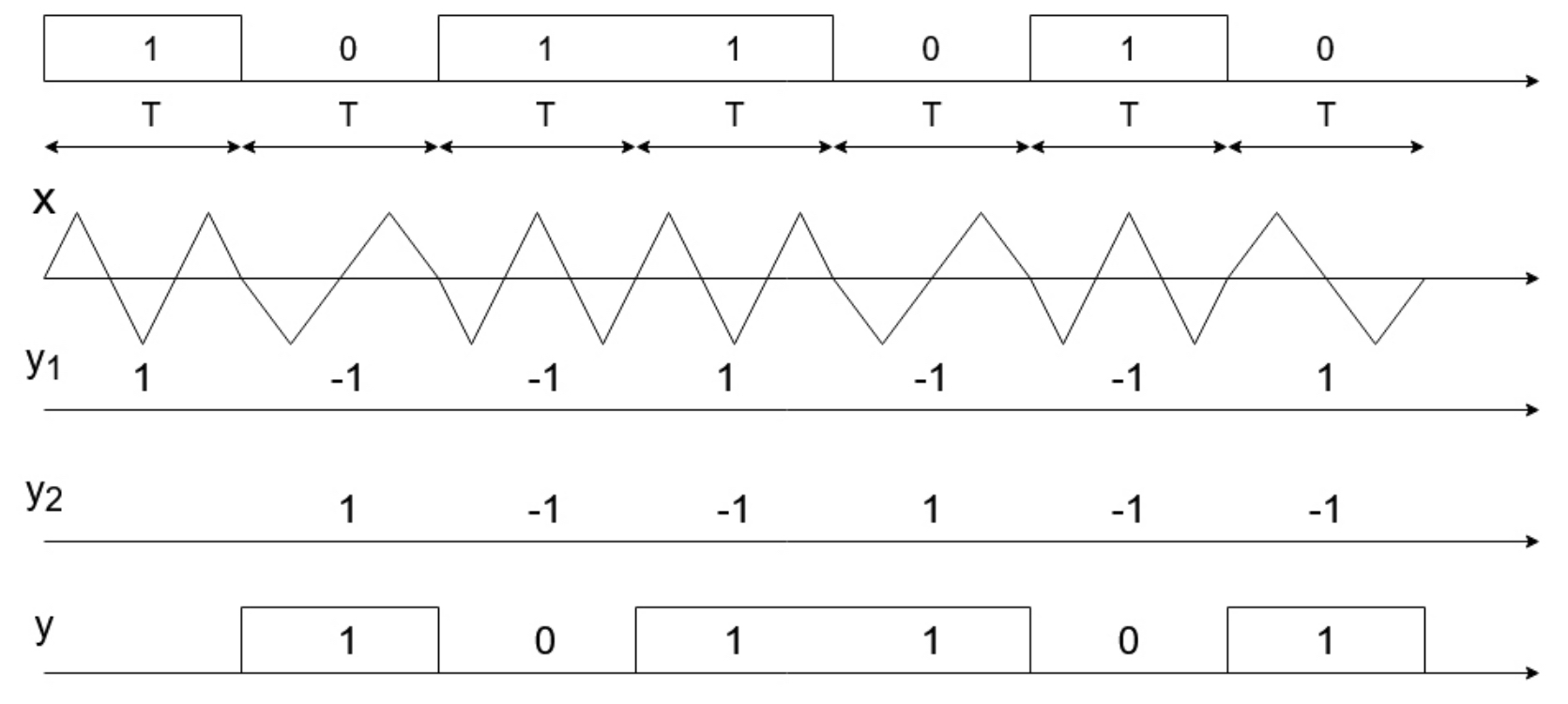 На первой верхней диаграмме показана подлежащая передаче последовательность посылок 1 0 1 1 0 1 0 длительностью Т каждая. На передающей стороне в модуляторе посылке 1 ставится в соответствие модулирующий сигнал хм(t) = 1, а посылке 0 модулирующий сигнал хм(t) = –1. На второй диаграмме показан сформированный в соответствии с этой последовательностью посылок сигнал МЧМ из отрезков синусоид. Для простоты графического исполнения вместо синусоиды изображены треугольные сигналы, что не влияет на принцип работы демодулятора сигналов МЧМ. Из второй диаграммы рис. 2 видно, что при передаче посылки 0 число полупериодов синусного сигнала Nн = 2, а при передаче посылки 1 число полупериодов синусного сигнала Nв = 3. Из этой же диаграммы видно, что фаза сигнала непрерывная. Благодаря этому начальная фаза сигналов x1(t) и x2(t) на интервале посылки Т может принимать значения 0 или Таким образом модуляция в сигнале МЧМ по природе соответствует модуляции с противоположными сигналами. В результате в сигнале МЧМ может быть четыре варианта передаваемого сигнала: два варианта с разными частотами fв и fн и два варианта с разными начальными фазами 0 или на интервале посылки Т. Как видно из рис. 1 входной сигнал поступает на два перемножителя, на вторые входы которых поступают когерентные с сигналами x1(t) и x2(t) колебания частот fв и fн, причем на верхний перемножитель поступает колебание синуса с частотой fв, а на нижний перемножитель поступает колебание синуса с частотой fн. Если включить на выходы этих перемножителей два интегратора, то в соответствии с формулой (1) на выходе интегратора перемножителя сигналов с несовпадающими частотами сигнал в конце посылки будет равен нулю. А на выходе интегратора перемножителя сигналов с совпадающими частотами сигнал в конце посылки будет положительным или отрицательным в зависимости от того, с какой начальной фазой 0 или поступил входной сигнал х. Из сказанного следует, что на выходе одного из интеграторов сигнал в конце посылки будет равен нулю. Принимая это во внимание, а также то, интеграл суммы равен сумме интегралов, в схеме демодулятора можно вместо двух интеграторов оставить один интегратор и включить его на выходе сумматора сигналов с выходов перемножителей, как это сделано на рис. 1. На выходе интегратора включен блок sign, формирующий сигнал у1 по следующему алгоритму: если на входе блока sign сигнал в конце посылки положительный, то у1 = 1, если на входе блока sign сигнал в конце посылки отрицательный, то сигнал у1 = –1. Поясним, как формируется сигнал у1, приведенный на третьей диаграмме. Сигнал от первой посылки с частотой fв поступает с начальной фазой, равной нулю. Опорные колебание всегда формируются с начальной фазой равной нулю, поэтому в конце приема первой посылки на выходе интегратора сигнал будет положительный и сигнал у1 = 1. При передаче второй посылки сигнал х на частоте fн имеет начальную фазу поэтому сигнал на выходе верхнего интегратора в конце второй посылки будет отрицательным, следовательно у1 = –1. При передаче третьей посылки сигнал х на частоте fв имеет начальную фазу поэтому сигнал на выходе интегратора в конце третьей посылки также будет отрицательным, следовательно у1 = –1. А при передаче четвертой посылки сигнал х на частоте fв имеет начальную фазу 0, поэтому сигнал на выходе интегратора в конце четвертой 