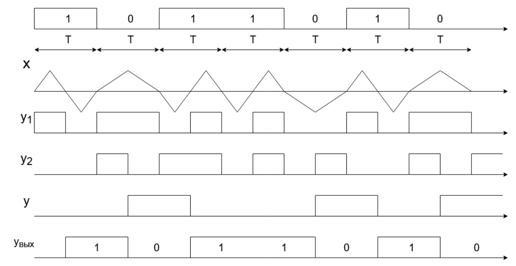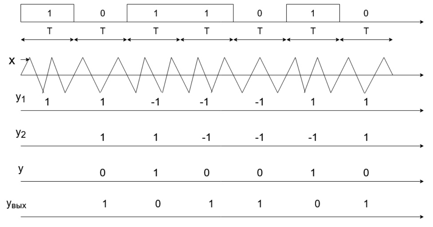 На верхней диаграмме приведены подлежащие передаче посылки 1 0 1 1 0 1 0 длительностью T. На второй диаграмме приведен сигнал МЧМ х, сформированный из отрезков синусоид, причем при передаче 1 за время T укладывается 2 полупериода синусоиды с частотой fв, а при передаче 0 за время T укладывается 1 полупериод синусоиды с частотой fн, при этом фаза сигнала х непрерывная. На третьей диаграмме приведен сигнал на выходе ограничителя у1, сформированный в соответствии с алгоритмом работы ограничителя. На четвертой диаграмме приведен сигнал у2 на выходе регистра, это задержанный на время T сигнал у1. Если сложить сигналы у1 и у2 по модулю 2, то получим сигнал у на выходе узла М2. Сигнал у является инверсией передаваемых посылок, т. к. число Nн = 1 является нечетным. На шестой диаграмме приведен выходной сигнал демодулятора увых, являющийся инверсией сигнала у. Сравнивая сигналы на первой и шестой диаграммах убеждаемся, что выходной сигнал демодулятора увых совпадает с передаваемыми посылками. Сформировать сигнал МЧМ из отрезков синусоиды или косинусоиды с числами Nн = 1, Nв = 2 цифровым способом не представляет трудности. Затем с помощью гетеродина и преобразователя частоты этот сигнал переносится в диапазон высоких частот для передачи по радиоканалу. На приемной стороне с помощью преобразователя и гетеродина частоту сигнала снова приводят в первоначальное значение. При этом условие fв = 2fн служит критерием для обеспечения синхронизации частоты гетеродина в преобразователе приемника.