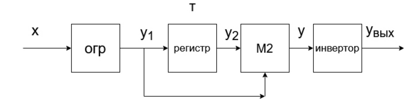 В состав схемы демодулятора входит ограничитель на входе, последовательный регистр, задерживающий входной цифровой сигнал у1 на длительность посылки Т, узел сложения по модулю 2 и инвертор на выходе. В [2] показано, что в этом демодуляторе при изменении частоты входного сигнала смена знака сигнала на выходе узла М2 сопровождается дроблениями. Длительность импульсов дробления изменяется на величину 0,5(Тн – Тв) по арифметической прогрессии, а число этих импульсов равно m1 = fн / fp. Суммарная длительность импульсов дробления равна: