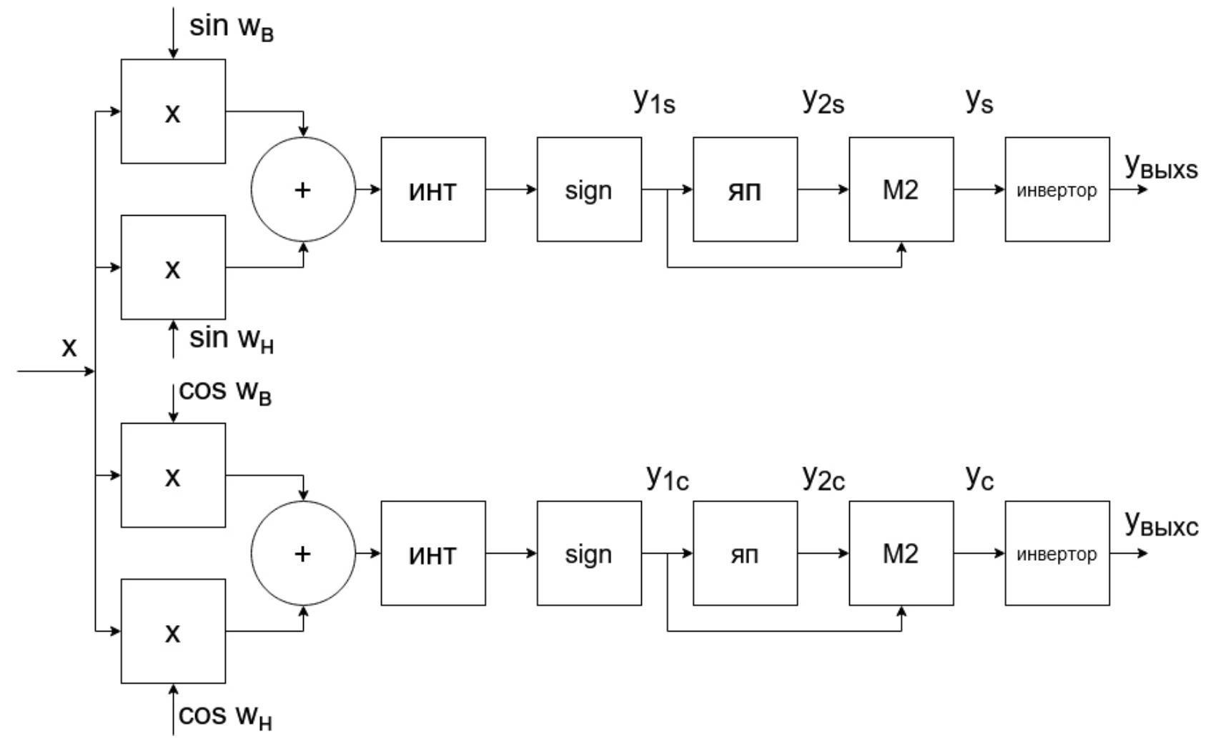 В схеме двухканального демодулятора на рис. 6 оба канала идентичны. Отличие состоит только в том, что на вторые входы перемножителей в верхнем канале поступают колебания синуса частот ωв = 2πƒв, и ωн = 2πƒн, а на вторые входы перемножителей в нижнем канале поступают колебания косинуса частот ωв = 2πƒв, и ωн = 2πƒн .
