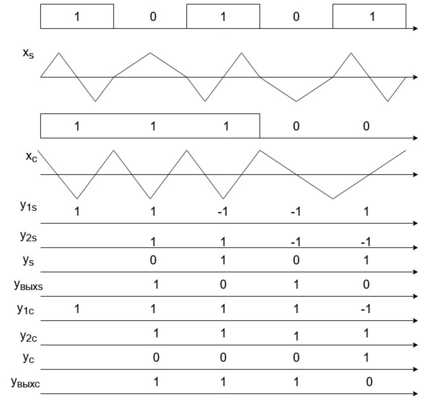Рис. 5. Временные диаграммы, поясняющие работу демодулятора сигнала МЧМ с бинарным квантованием сигнала при Nн = 1, Nв = 2