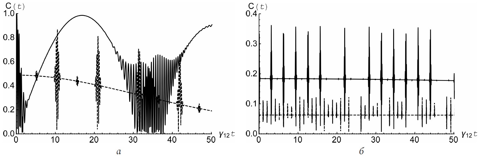 Рис. 1. Зависимость согласованности C(t) от приведенного времени γ12t для сепарабельного начального состояния кубитов |e,e (или |g,g). Среднее число фотонов n¯=30. Случай (а) соответствует χ=0 (сплошная линия) и χ=0,3 (штриховая линия). Случай (б) соответствует χ=1 (сплошная линия) и χ=3 (штриховая линия)