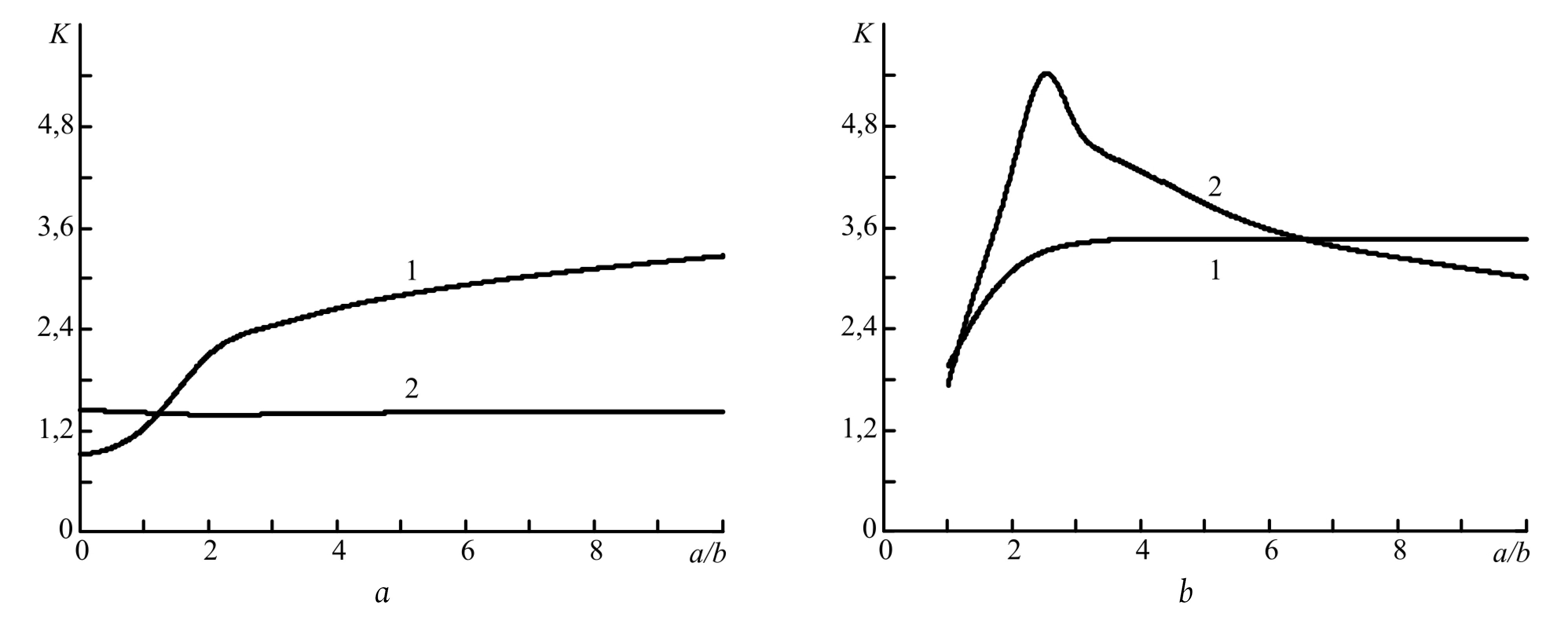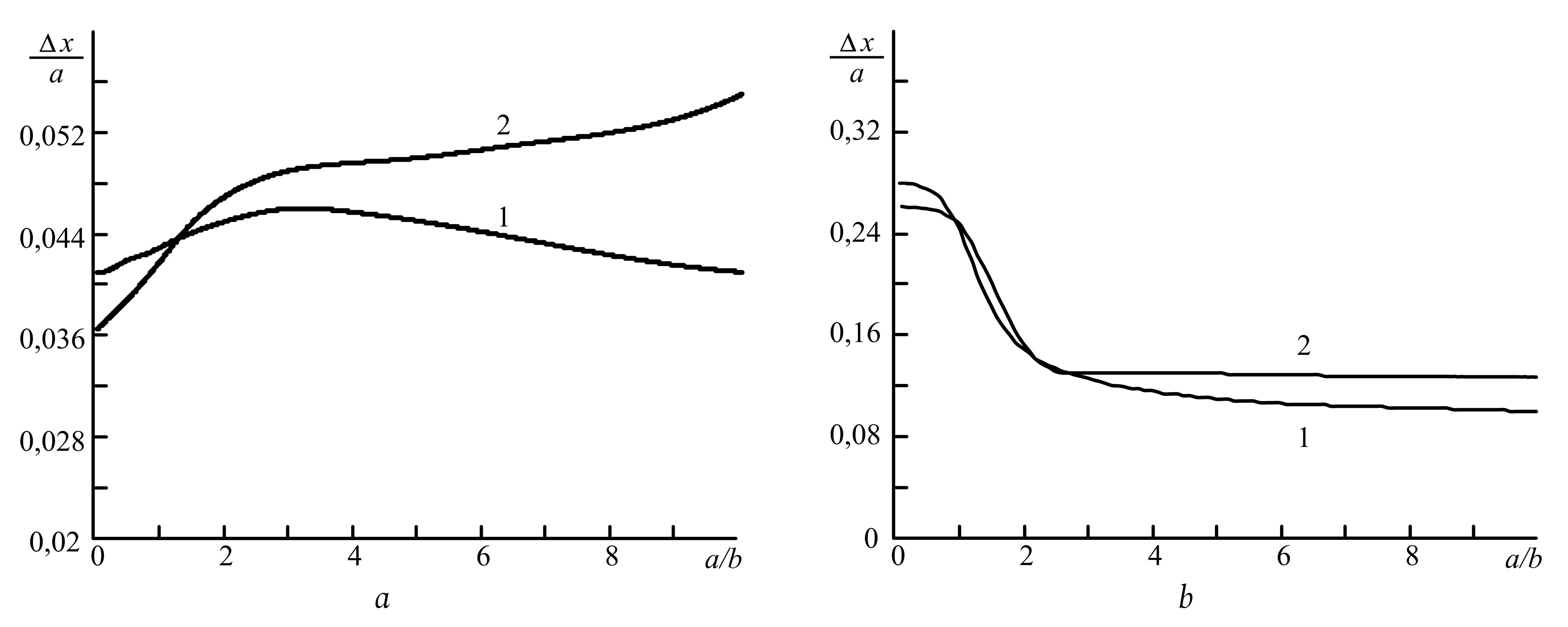 Рис. 2. Зависимость полуширины центрального максимума модуля ФРТ от ширины гауссовой волны накачки: вторая волна накачки гауссова, первая волна накачки одномодовая (1); первая волна накачки гауссова, вторая волна накачки одномодовая (2) при (а), 0,5 (б)