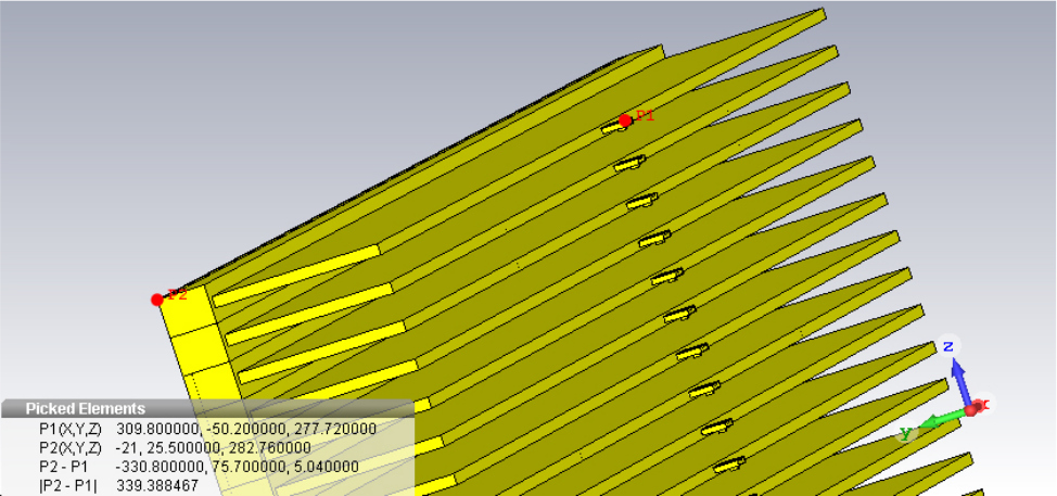 В настоящей статье рассмотрена линейная эквидистантная антенная решетка с равноамплитудным и синфазным возбуждением, состоящая из открытых концов волноводов сечением 19 мм на 11 мм с воздушным заполнением. Период решетки – 19,5 мм. Габаритные размеры разработанной антенной решетки: ширина раскрыва – 624 мм, высота – 12 мм, глубина – 118 мм. Особенностью конструкции антенной решетки является использование плавных несимметричных переходов в Е-плоскости по экспоненциальному закону; в раскрыве ФАР чередуются с периодом, равным 4 значениям ширины волноводов с учетом ширины их узких стенок, волноводные несимметричные рупоры, расширяющиеся в верхнем (2 соседних излучателя) и нижнем (следующие 2 излучателя) направлениях.